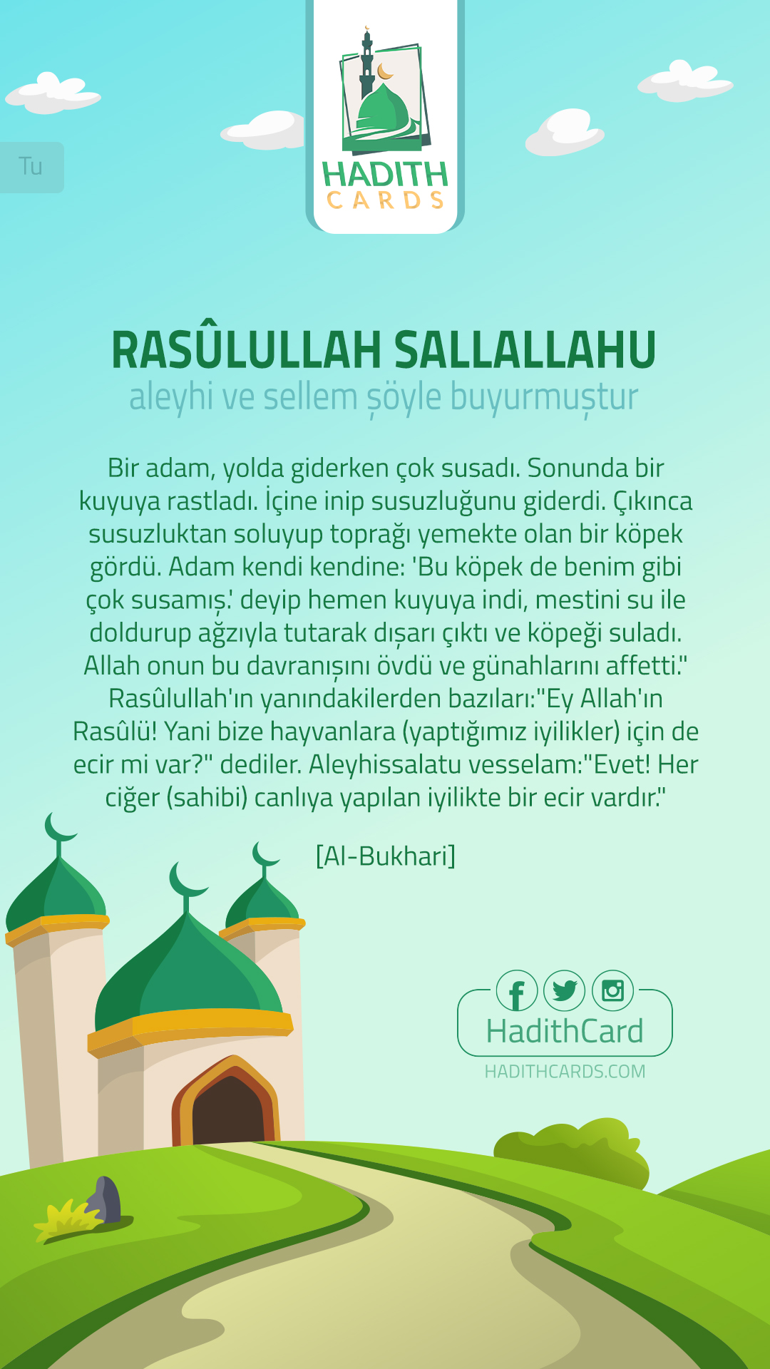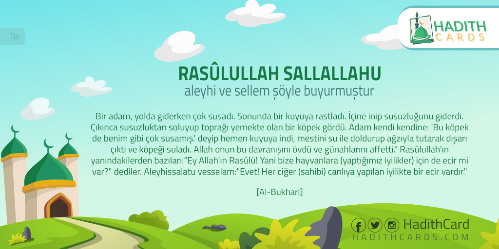 Ey Allah'ın Rasûlü! Yani bize hayvanlara (yaptığımız iyilikler) için de ecir mi var?" dediler. Aleyhissalatu vesselam:"Evet! Her ciğer (sahibi) canlıya yapılan iyilikte bir ecir vardır