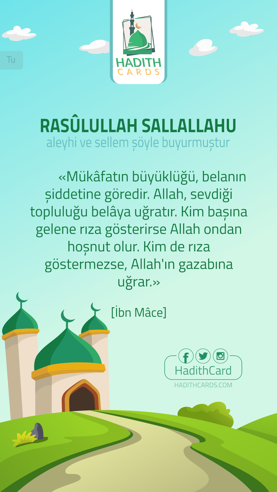 Mükâfatın büyüklüğü, belanın şiddetine göredir. Allah, sevdiği topluluğu belâya uğratır. Kim başına gelene rıza gösterirse Allah ondan hoşnut olur. Kim de rıza göstermezse, Allah'ın gazabına uğrar