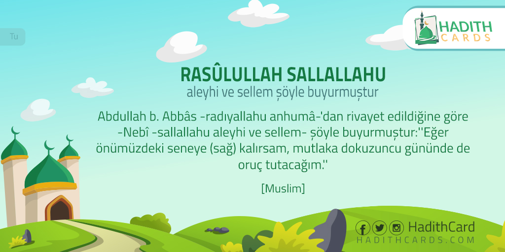 Abdullah b. Abbâs -radıyallahu anhumâ-'dan rivayet edildiğine göre -Nebî -sallallahu aleyhi ve sellem- şöyle buyurmuştur:''Eğer önümüzdeki seneye (sağ) kalırsam, mutlaka dokuzuncu gününde de oruç tutacağım
