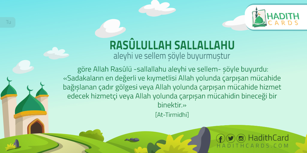 göre Allah Rasûlü -sallallahu aleyhi ve sellem- şöyle buyurdu: «Sadakaların en değerli ve kıymetlisi Allah yolunda çarpışan mücahide bağışlanan çadır gölgesi veya Allah yolunda çarpışan mücahide hizmet edecek hizmetçi veya Allah yolunda çarpışan mücahidin bineceği bir binektir