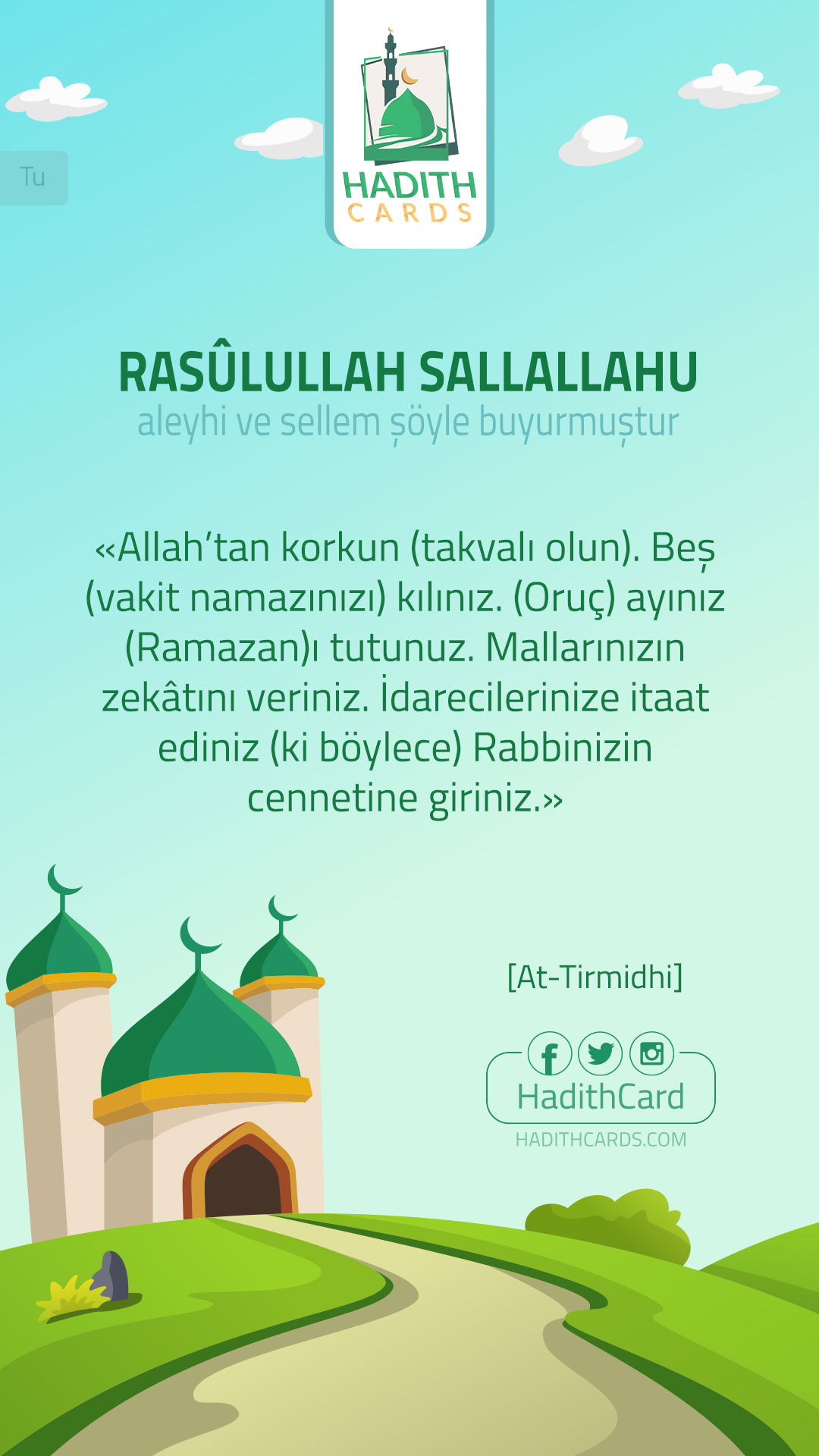 Allah’tan korkun (takvalı olun). Beş (vakit namazınızı) kılınız. (Oruç) ayınız (Ramazan)ı tutunuz. Mallarınızın zekâtını veriniz. İdarecilerinize itaat ediniz (ki böylece) Rabbinizin cennetine giriniz
