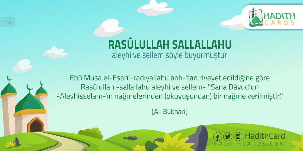 Sana Dâvud’un -Aleyhisselam-'ın nağmelerinden (okuyuşundan) bir nağme verilmiştir.''Müslim'in rivayetinde:Rasûlullah -sallallahu aleyhi ve sellem- ona şöyle buyurdu:''Eğer beni görseydin senin dünkü okuyuşunu dinliyordum
