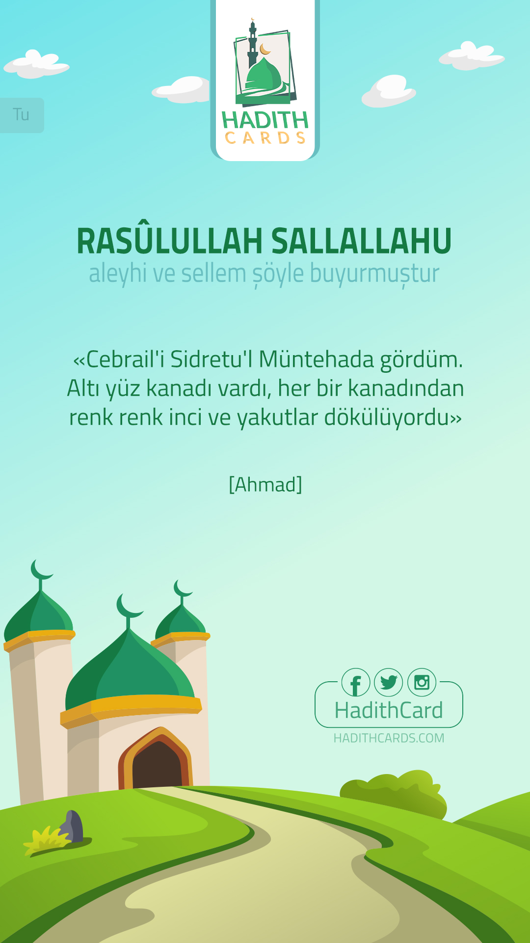 Andolsun ki, o, Cebrail’i bir başka inişte daha (aslî suretiyle) görmüştü} [Necm Suresi: 13] Rasûlullah -sallalalhu aleyhi ve sellem- şöyle buyurmuştur: «Cebrail'i Sidretu'l Müntehada gördüm. Altı yüz kanadı vardı, her bir kanadından renk renk inci ve yakutlar dökülüyordu