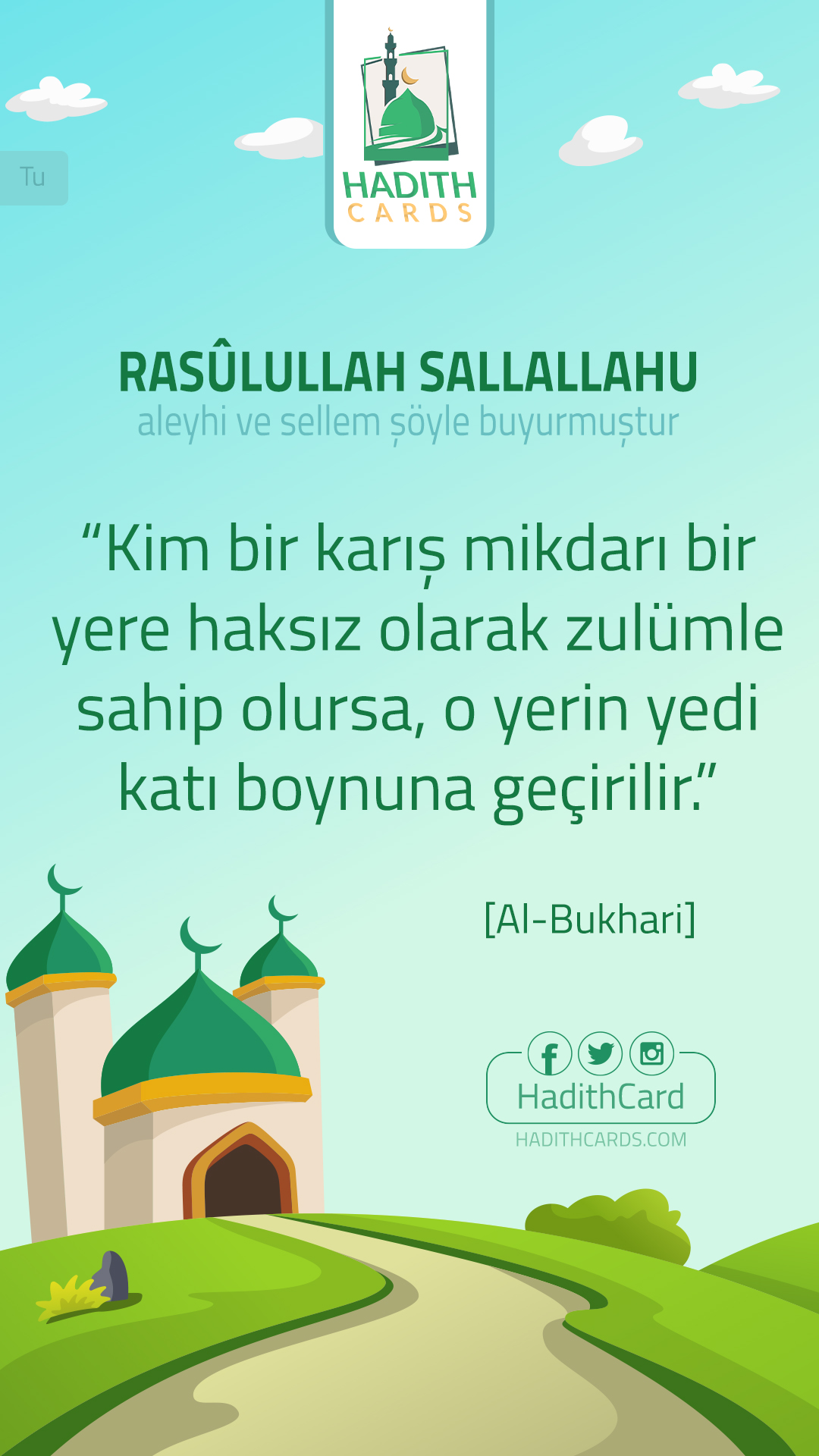 "«مَنْ ظَلَم قِيدَ شِبْرٍ مِن الأرْضِ؛ طُوِّقَهُ مِن سَبْعِ أَرَضِين». [صحيح.] - [متفق عليه.]"