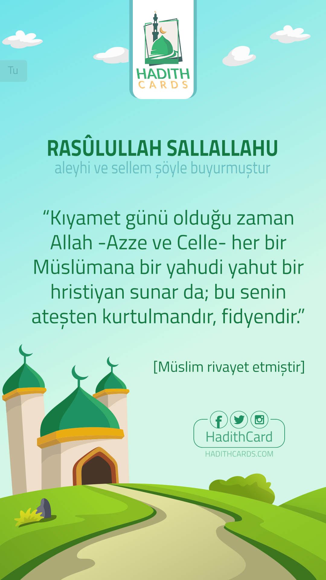 Kıyamet günü olduğu zaman Allah -Azze ve Celle- her bir Müslümana bir yahudi yahut bir hristiyan sunar da; bu senin ateşten kurtulmandır, fidyendir