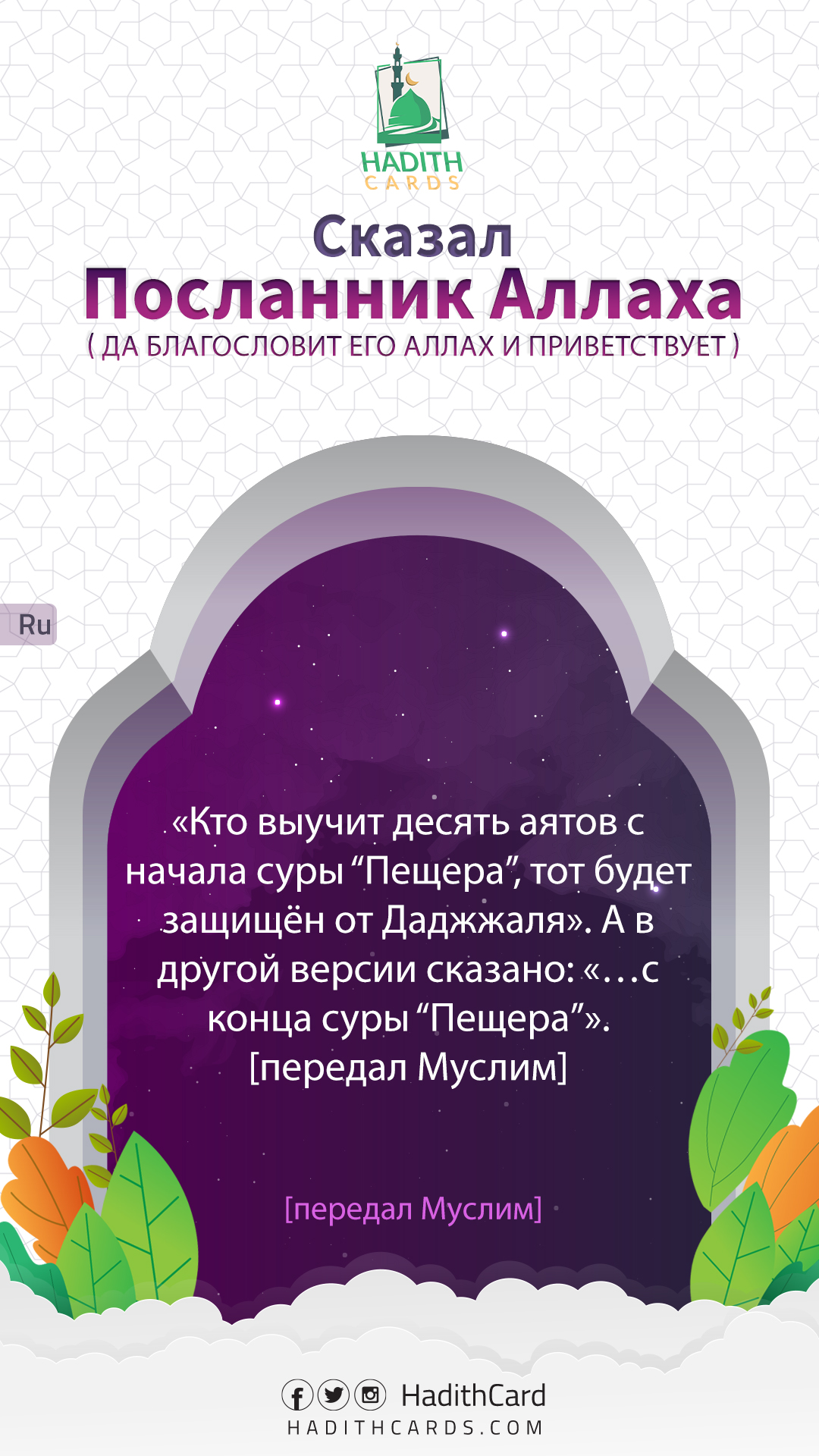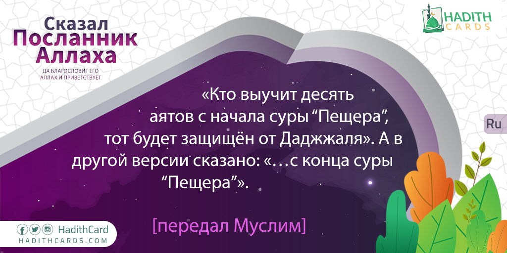 Кто выучит десять аятов с начала суры “Пещера”, тот будет защищён от Даджжаля». А в другой версии сказано: «…с конца суры “Пещера