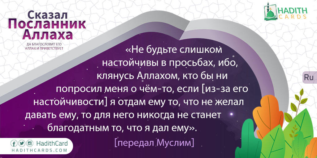 Не будьте слишком настойчивы в просьбах, ибо, клянусь Аллахом, кто бы ни попросил меня о чём-то, если [из-за его настойчивости] я отдам ему то, что не желал давать ему, то для него никогда не станет благодатным то, что я дал ему