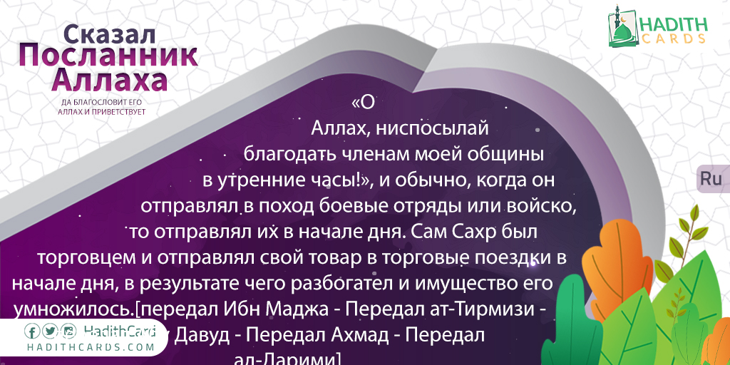 О Аллах, ниспосылай благодать членам моей общины в утренние часы!», и обычно, когда он отправлял в поход боевые отряды или войско, то отправлял их в начале дня. Сам Сахр был торговцем и отправлял свой товар в торговые поездки в начале дня, в результате чего разбогател и имущество его умножилось.[передал Ибн Маджа - Передал ат-Тирмизи - передал Абу Давуд - Передал Ахмад - Передал ад-Дарими]