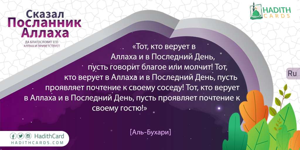 Тот, кто верует в Аллаха и в Последний День, пусть говорит благое или молчит! Тот, кто верует в Аллаха и в Последний День, пусть проявляет почтение к своему соседу! Тот, кто верует в Аллаха и в Последний День, пусть проявляет почтение к своему гостю!
