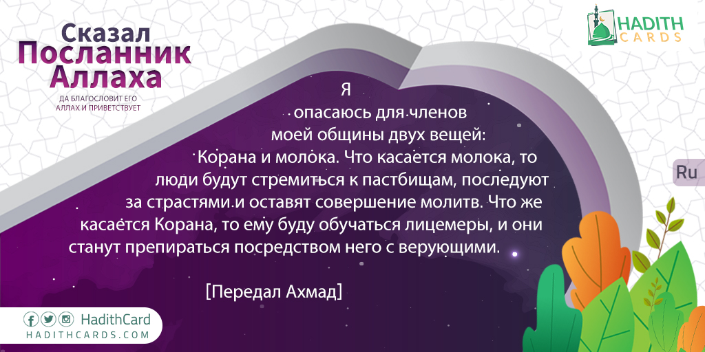 Я опасаюсь для членов моей общины двух вещей: Корана и молока. Что касается молока, то люди будут стремиться к пастбищам, последуют за страстями и оставят совершение молитв. Что же касается Корана, то ему буду обучаться лицемеры, и они станут препираться посредством него с верующими