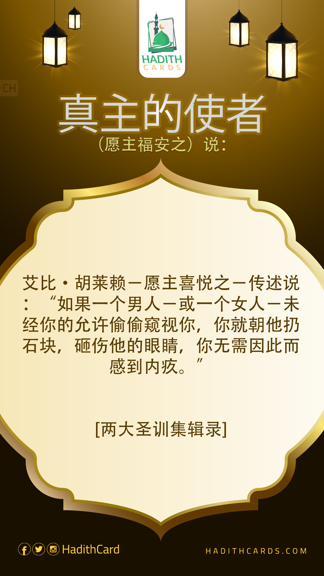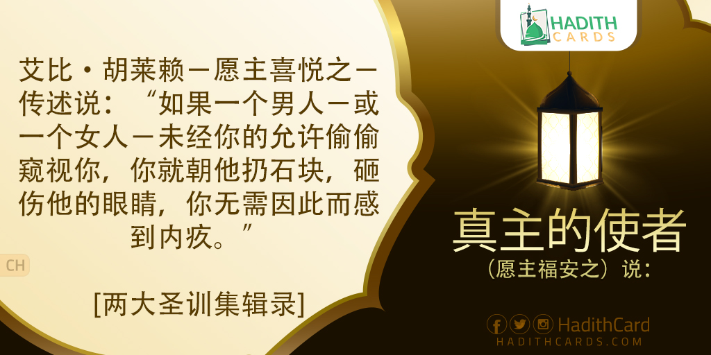 艾比•胡莱赖-愿主喜悦之-传述说:“如果一个男人-或一个女人-未经你的允许偷偷窥视你,你就朝他扔石块,砸伤他的眼睛,你无需因此而感到内疚