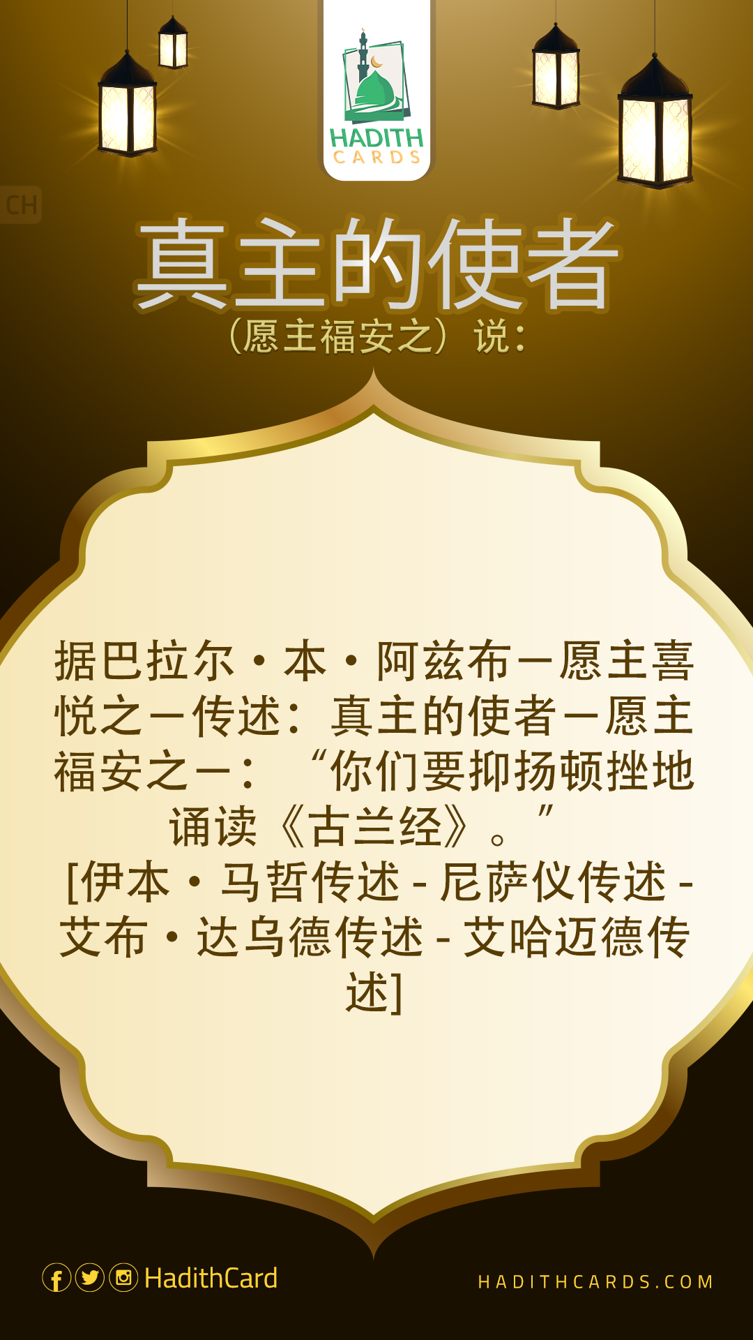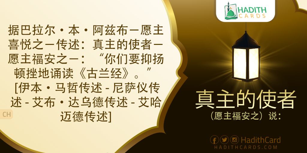 据巴拉尔·本·阿兹布-愿主喜悦之-传述:真主的使者-愿主福安之-:“你们要抑扬顿挫地诵读《古兰经》。