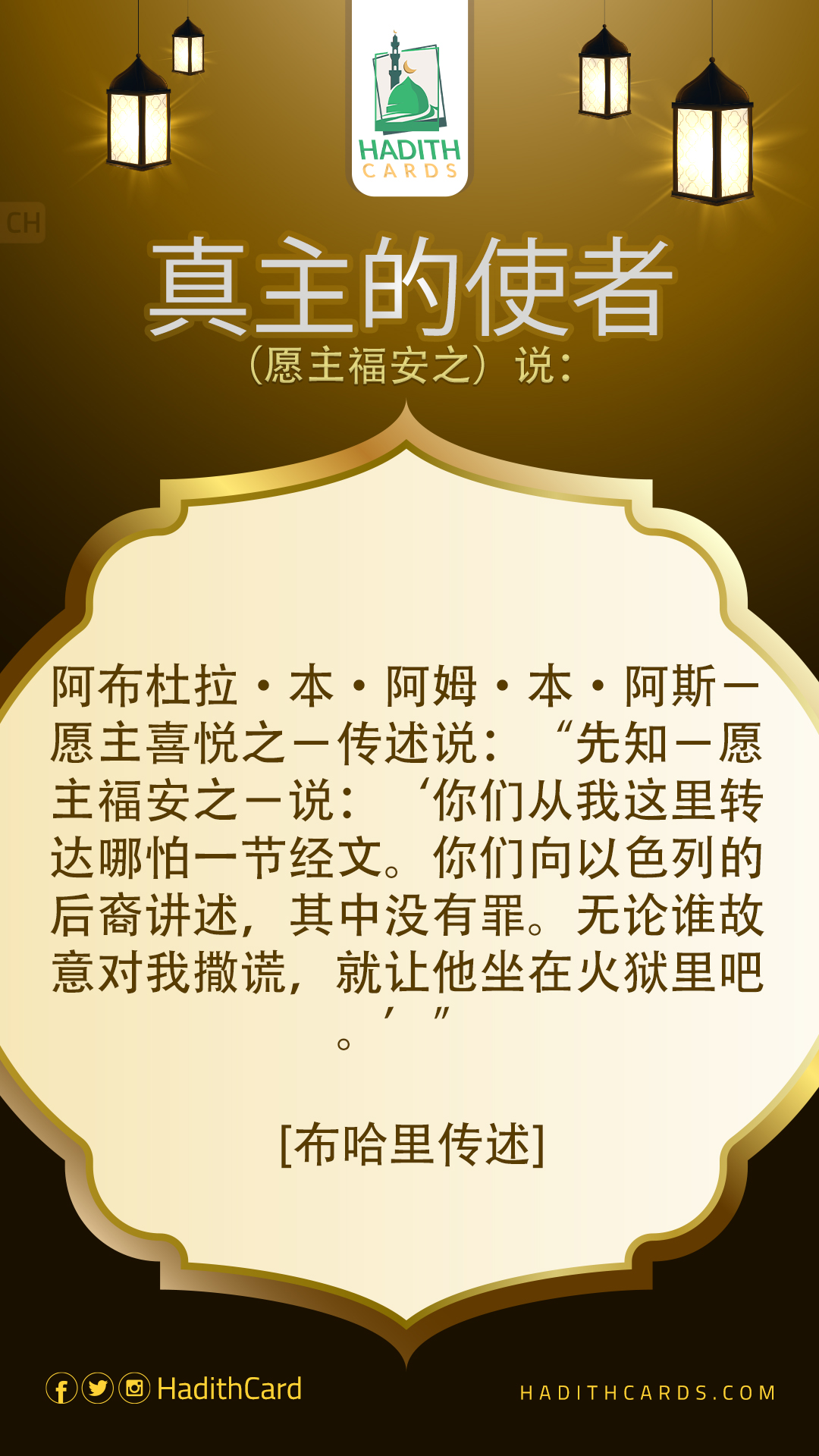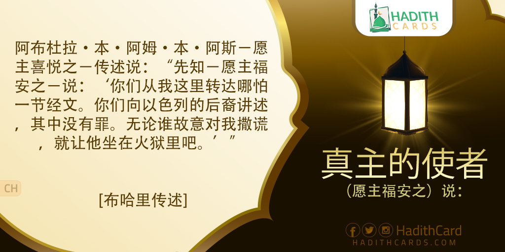 阿布杜拉·本·阿姆·本·阿斯-愿主喜悦之-传述说:“先知-愿主福安之-说:‘你们从我这里转达哪怕一节经文。你们向以色列的后裔讲述,其中没有罪。无论谁故意对我撒谎,就让他坐在火狱里吧。