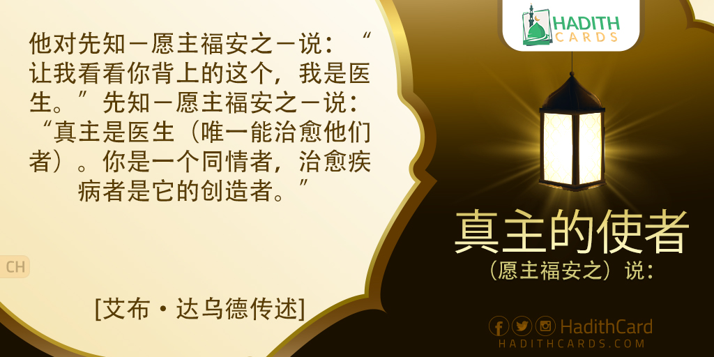 他对先知-愿主福安之-说:“让我看看你背上的这个,我是医生。”先知-愿主福安之-说:“真主是医生(唯一能治愈他们者)。你是一个同情者,治愈疾病者是它的创造者。