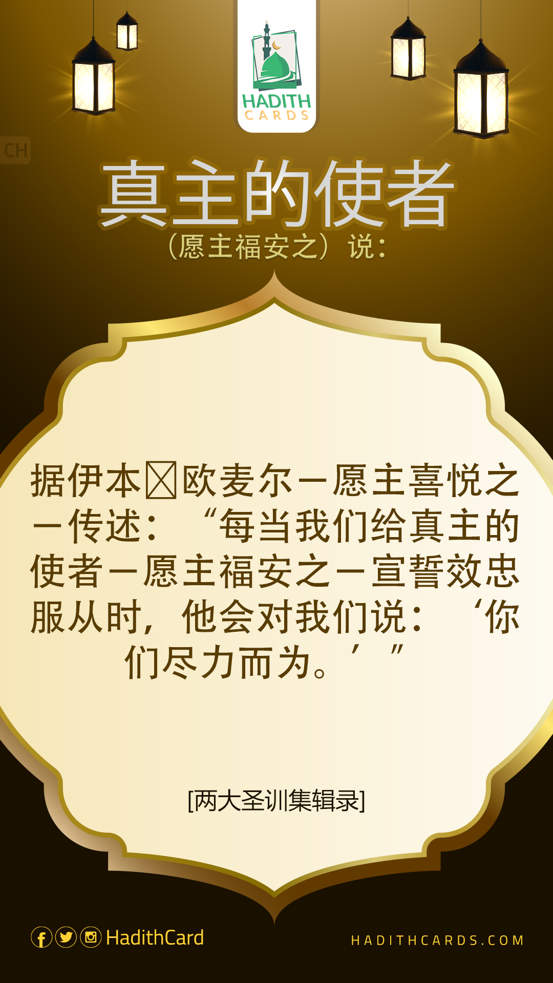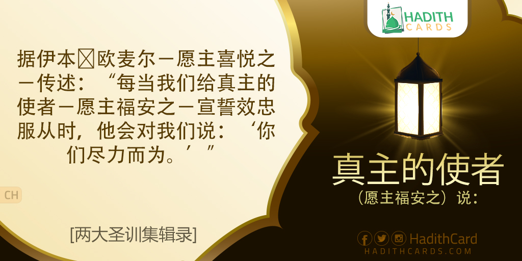 据伊本∙欧麦尔-愿主喜悦之-传述:“每当我们给真主的使者-愿主福安之-宣誓效忠服从时,他会对我们说:‘你们尽力而为。