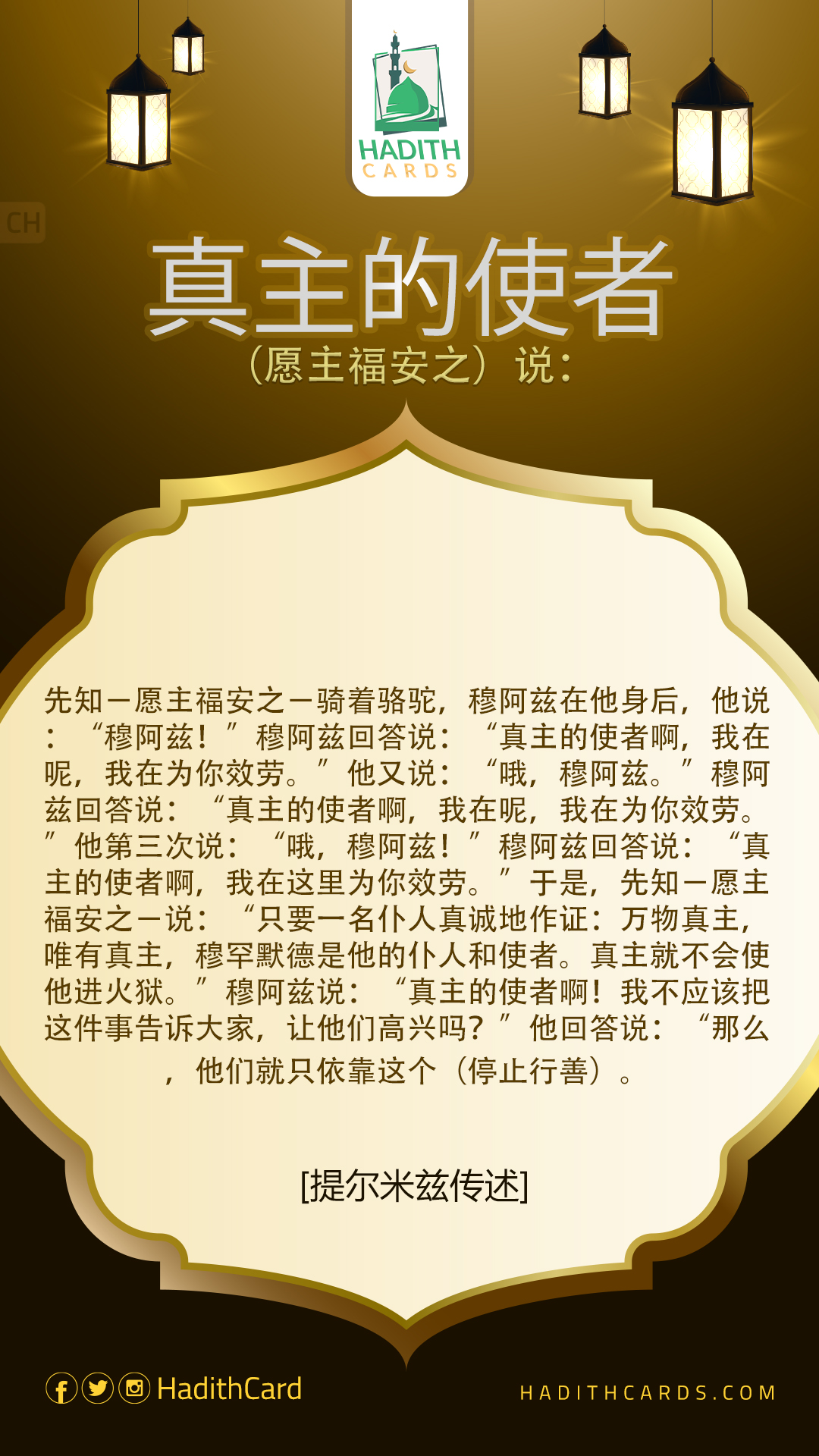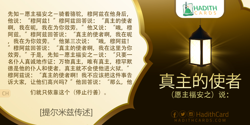 先知-愿主福安之-骑着骆驼,穆阿兹在他身后,他说:“穆阿兹!”穆阿兹回答说:“真主的使者啊,我在呢,我在为你效劳。”他又说:“哦,穆阿兹。”穆阿兹回答说:“真主的使者啊,我在呢,我在为你效劳。”他第三次说:“哦,穆阿兹!”穆阿兹回答说:“真主的使者啊,我在这里为你效劳。”于是,先知-愿主福安之-说:“只要一名仆人真诚地作证:万物真主,唯有真主,穆罕默德是他的仆人和使者。真主就不会使他进火狱。”穆阿兹说:“真主的使者啊!我不应该把这件事告诉大家,让他们高兴吗?”他回答说:“那么,他们就只依靠这个