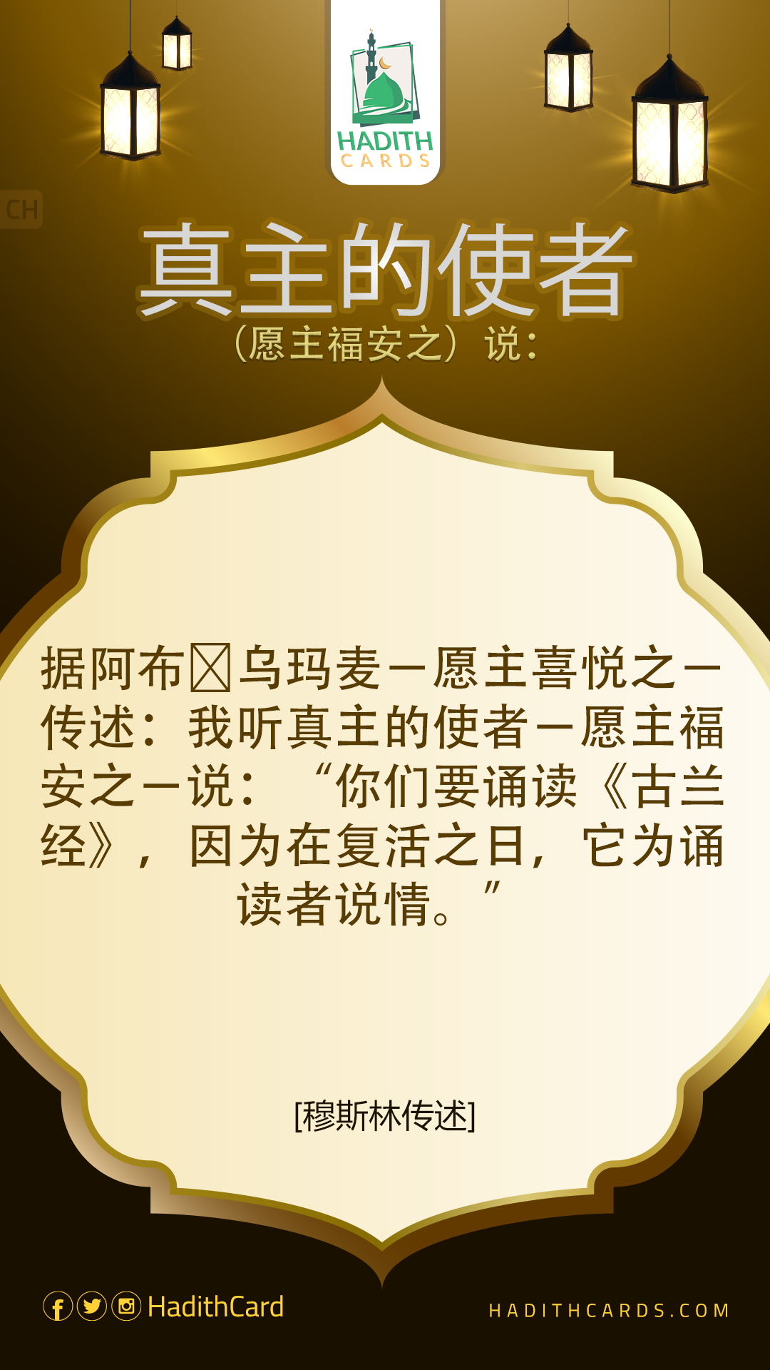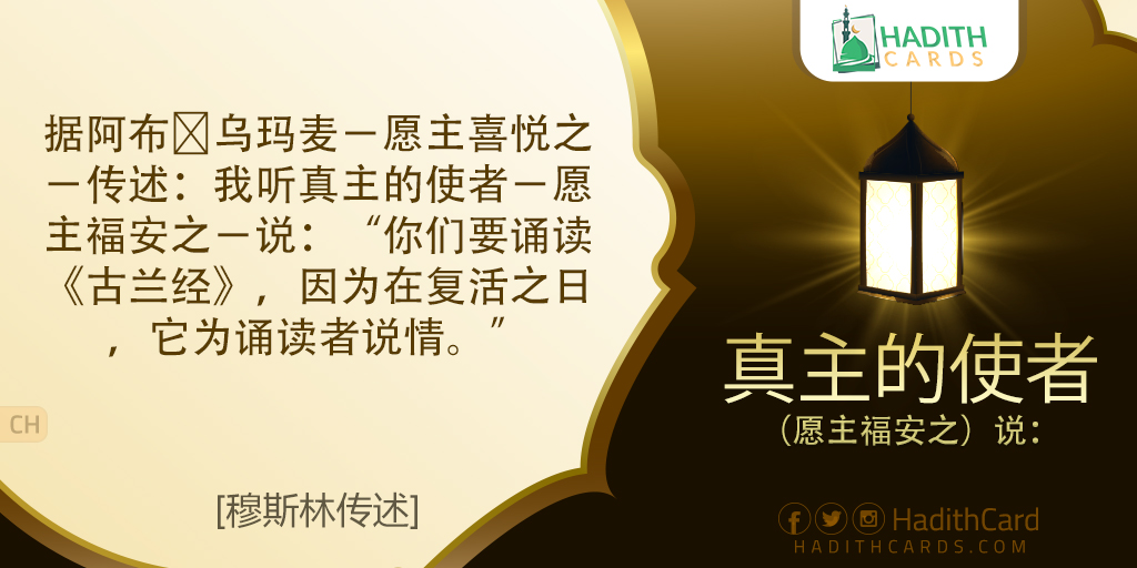 据阿布∙乌玛麦-愿主喜悦之-传述:我听真主的使者-愿主福安之-说:“你们要诵读《古兰经》,因为在复活之日,它为诵读者说情