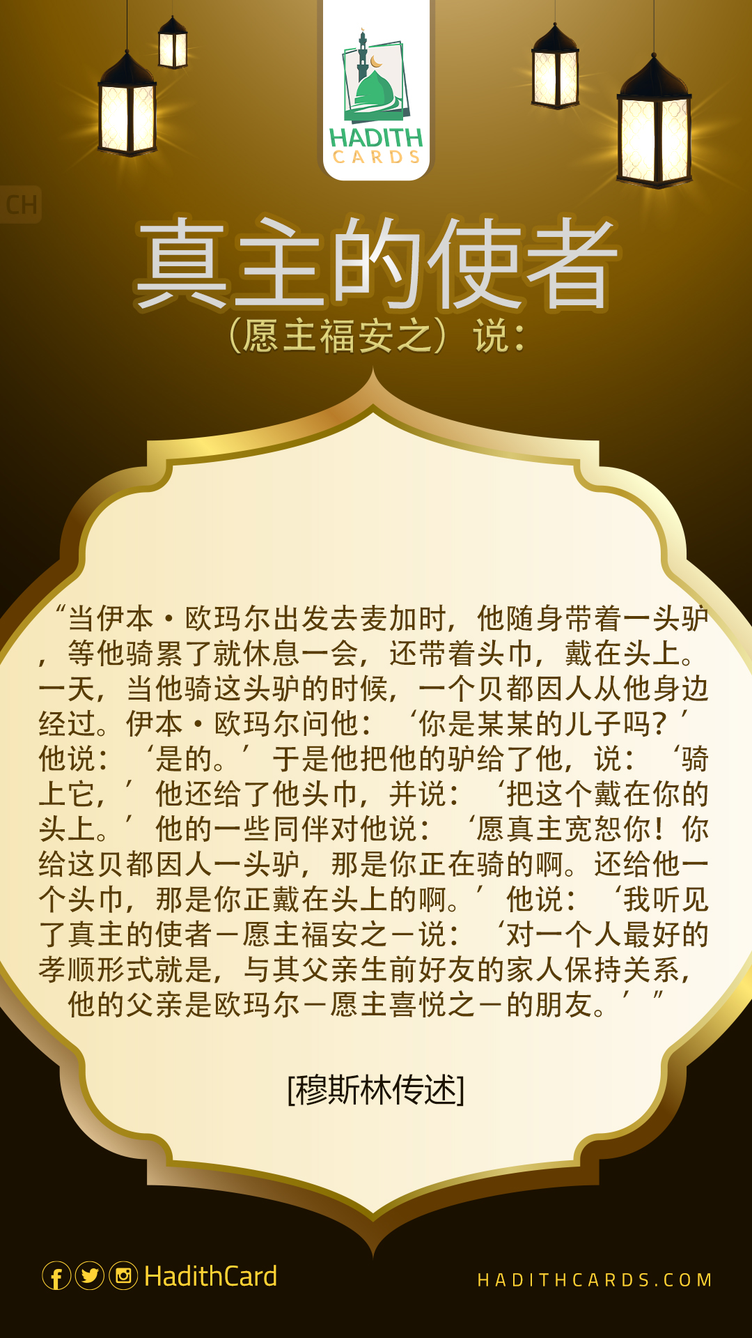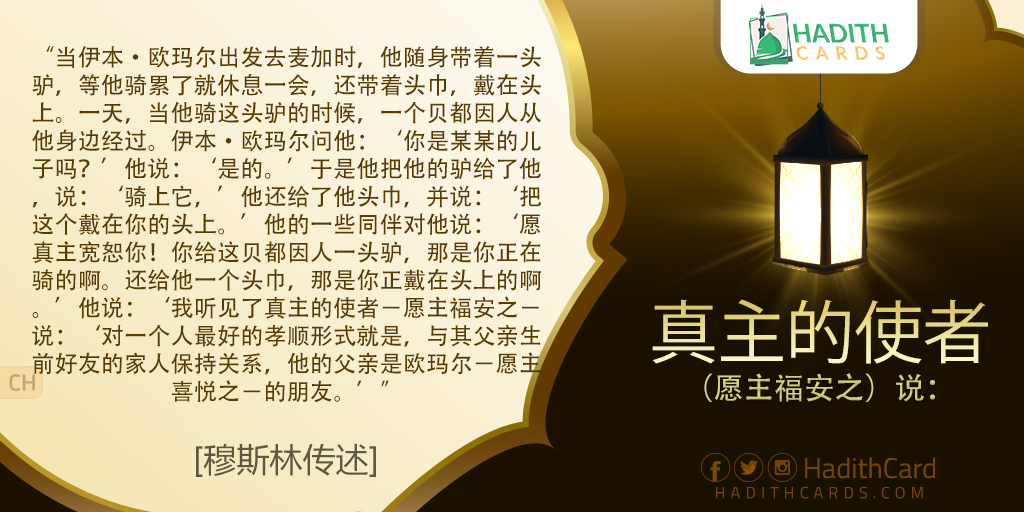 当伊本·欧玛尔出发去麦加时,他随身带着一头驴,等他骑累了就休息一会,还带着头巾,戴在头上。一天,当他骑这头驴的时候,一个贝都因人从他身边经过。伊本·欧玛尔问他:‘你是某某的儿子吗?’他说:‘是的。’于是他把他的驴给了他,说:‘骑上它,’他还给了他头巾,并说:‘把这个戴在你的头上。’他的一些同伴对他说:‘愿真主宽恕你!你给这贝都因人一头驴,那是你正在骑的啊。还给他一个头巾,那是你正戴在头上的啊。’他说:‘我听见了真主的使者-愿主福安之-说:‘对一个人最好的孝顺形式就是,与其父亲生前好友的家人保持关系,他的父亲是欧玛尔-愿主喜悦之-的朋友