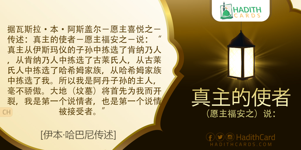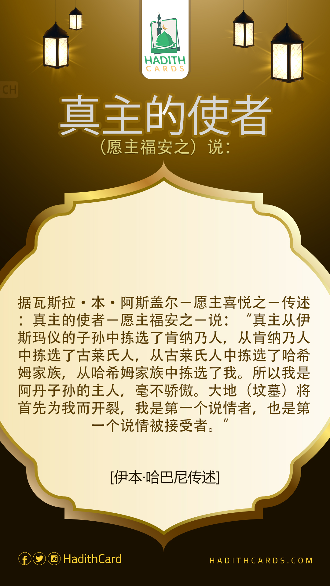 据瓦斯拉·本·阿斯盖尔-愿主喜悦之-传述:真主的使者-愿主福安之-说:“真主从伊斯玛仪的子孙中拣选了肯纳乃人,从肯纳乃人中拣选了古莱氏人,从古莱氏人中拣选了哈希姆家族,从哈希姆家族中拣选了我。所以我是阿丹子孙的主人,毫不骄傲。大地(坟墓)将首先为我而开裂,我是第一个说情者,也是第一个说情被接受者