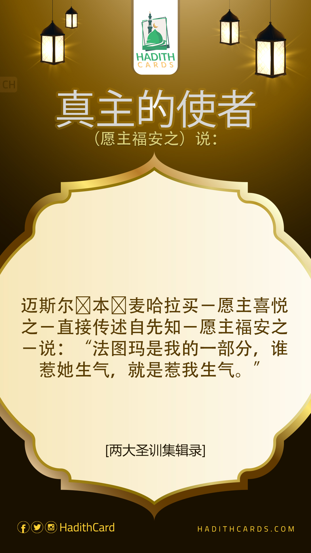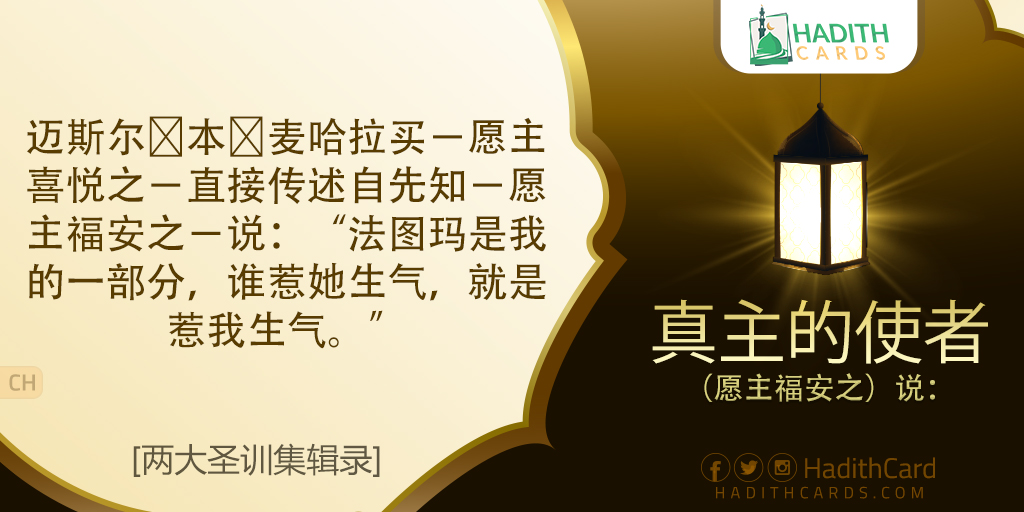 迈斯尔∙本∙麦哈拉买-愿主喜悦之-直接传述自先知-愿主福安之-说:“法图玛是我的一部分,谁惹她生气,就是惹我生气