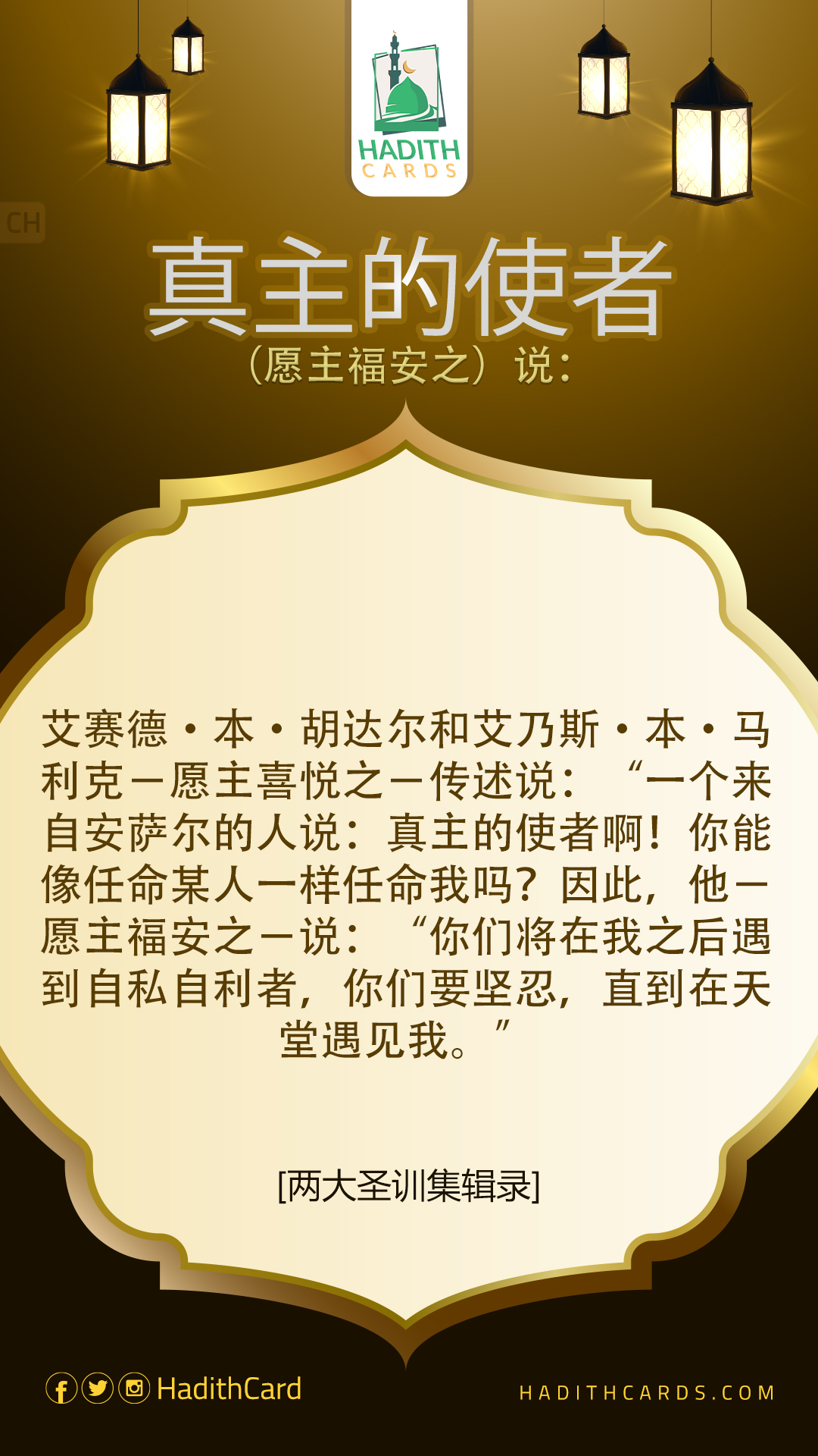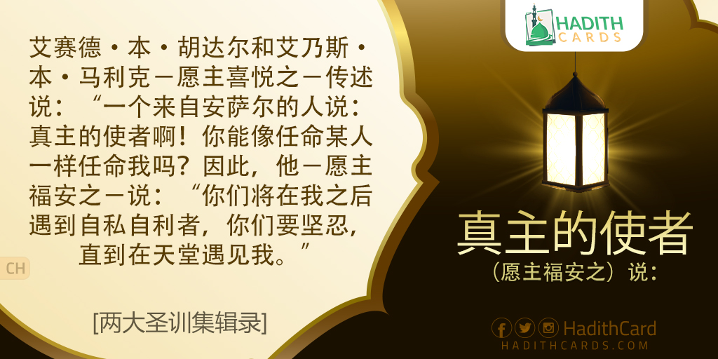 艾赛德·本·胡达尔和艾乃斯·本·马利克-愿主喜悦之-传述说:“一个来自安萨尔的人说:真主的使者啊!你能像任命某人一样任命我吗?因此,他-愿主福安之-说:“你们将在我之后遇到自私自利者,你们要坚忍,直到在天堂遇见我