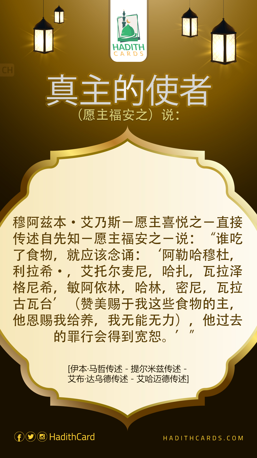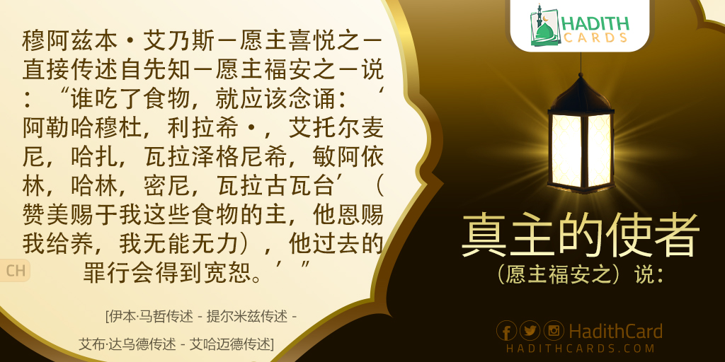 穆阿兹本·艾乃斯-愿主喜悦之-直接传述自先知-愿主福安之-说:“谁吃了食物,就应该念诵:‘阿勒哈穆杜,利拉希·,艾托尔麦尼,哈扎,瓦拉泽格尼希,敏阿依林,哈林,密尼,瓦拉古瓦台’(赞美赐于我这些食物的主,他恩赐我给养,我无能无力),他过去的罪行会得到宽恕。’”[伊本·马哲传述