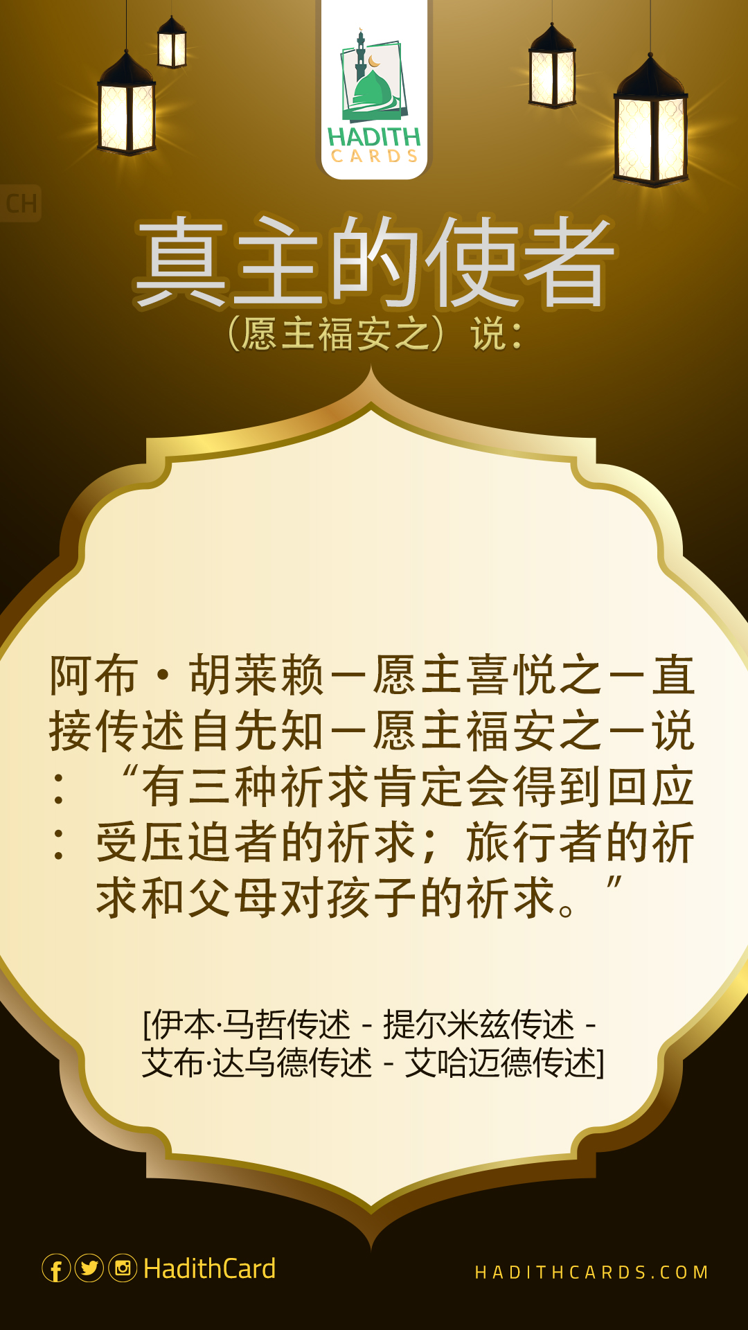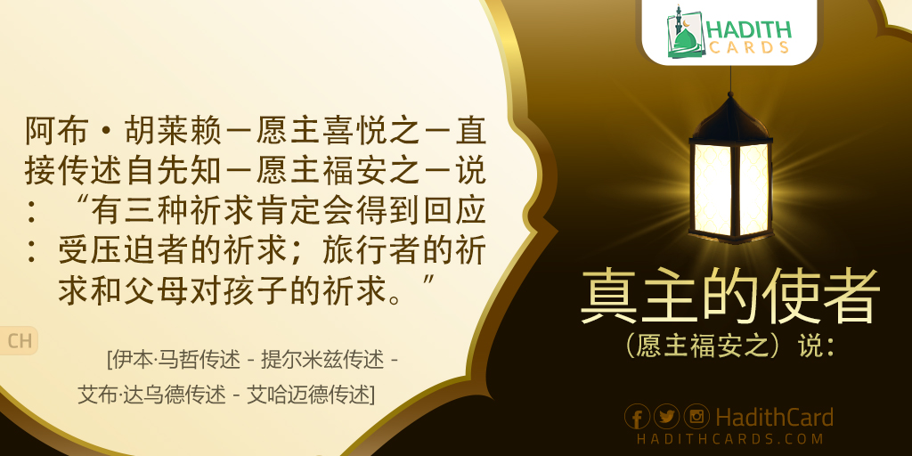 阿布·胡莱赖-愿主喜悦之-直接传述自先知-愿主福安之-说:“有三种祈求肯定会得到回应:受压迫者的祈求;旅行者的祈求和父母对孩子的祈求。