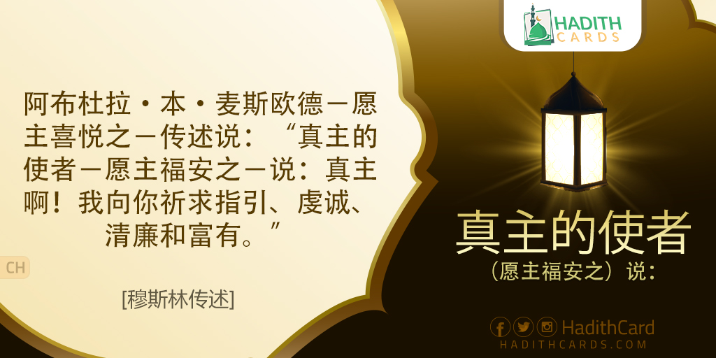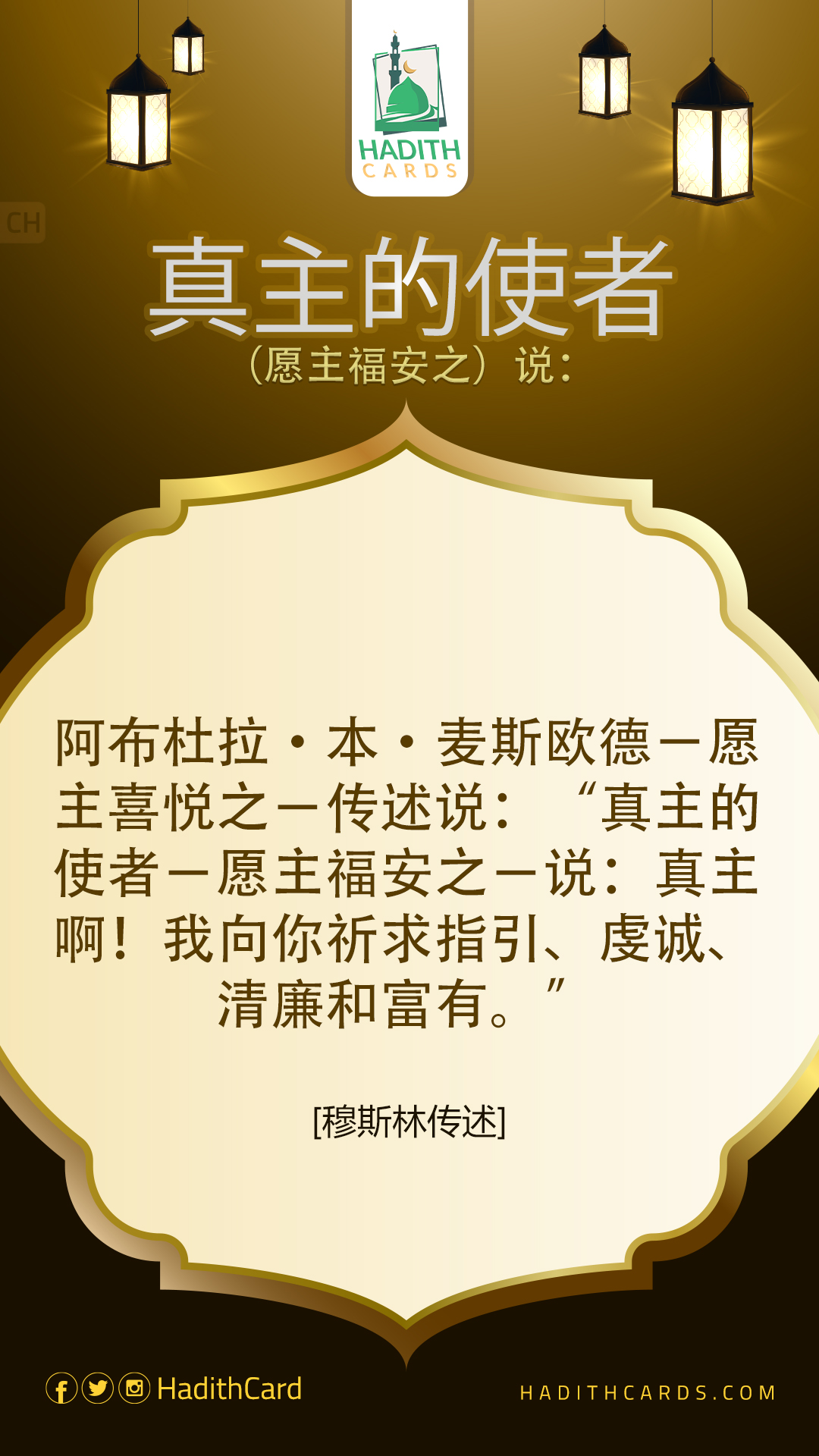 阿布杜拉·本·麦斯欧德-愿主喜悦之-传述说:“真主的使者-愿主福安之-说:真主啊!我向你祈求指引、虔诚、清廉和富有