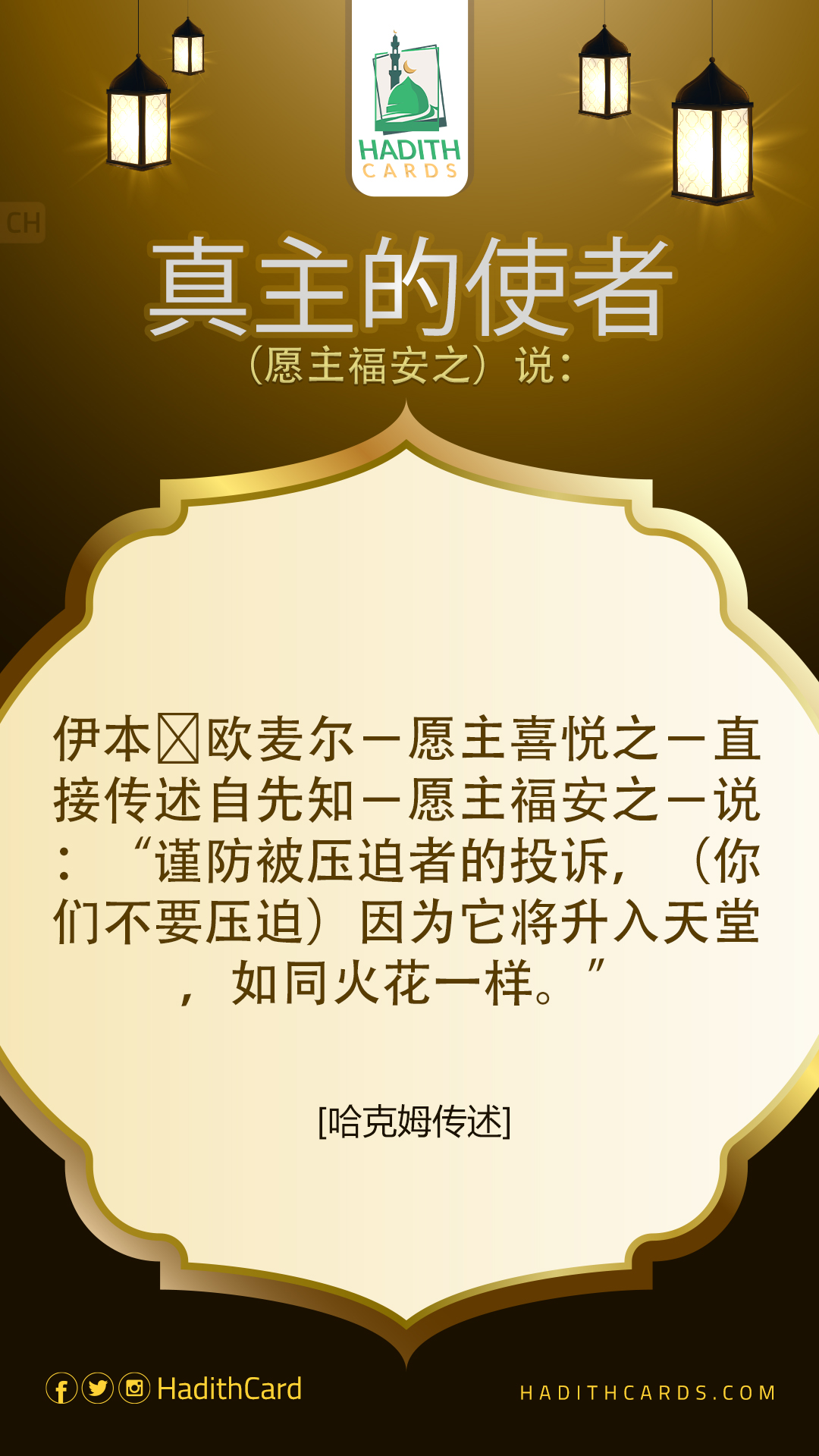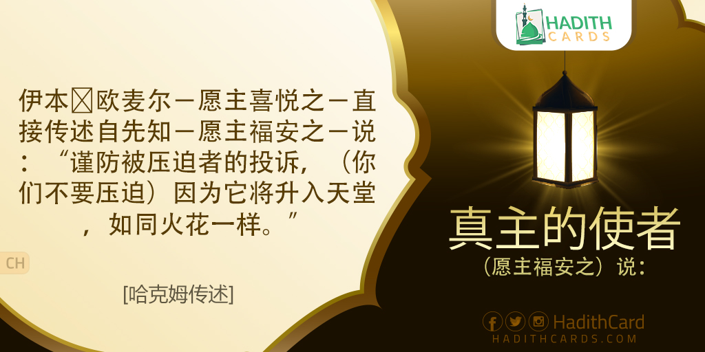 伊本∙欧麦尔-愿主喜悦之-直接传述自先知-愿主福安之-说:“谨防被压迫者的投诉,(你们不要压迫)因为它将升入天堂,如同火花一样