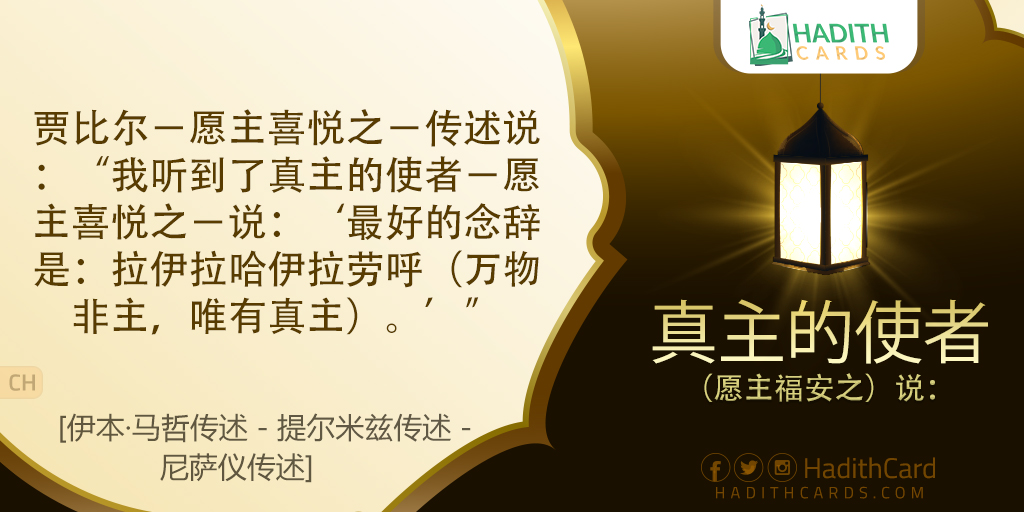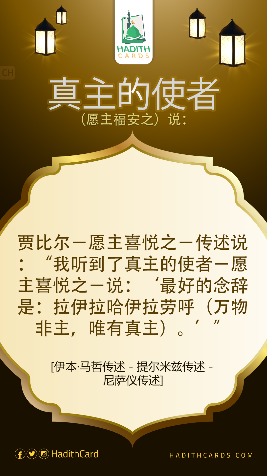 贾比尔-愿主喜悦之-传述说:“我听到了真主的使者-愿主喜悦之-说:‘最好的念辞是:拉伊拉哈伊拉劳呼(万物非主,唯有真主)。