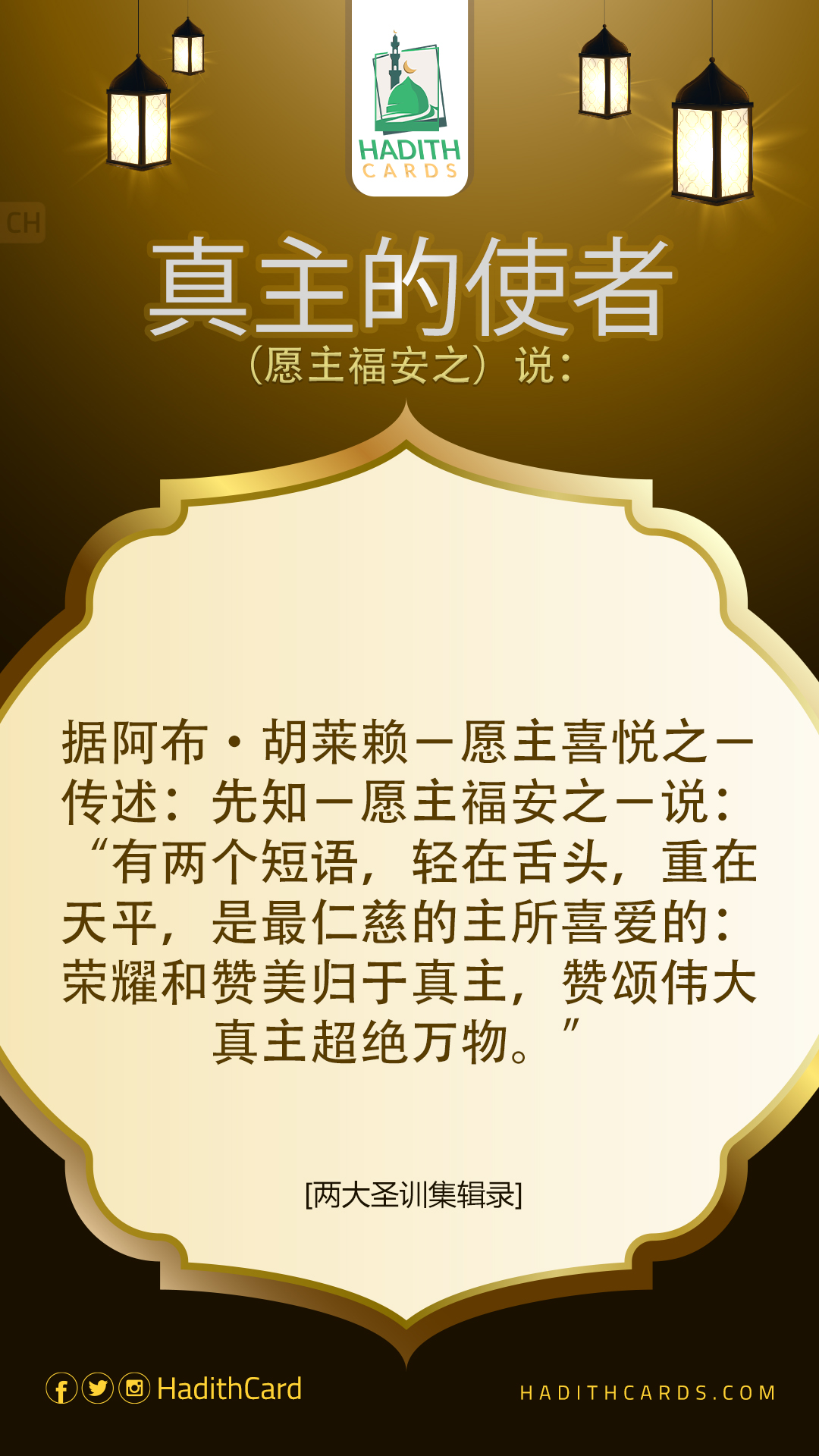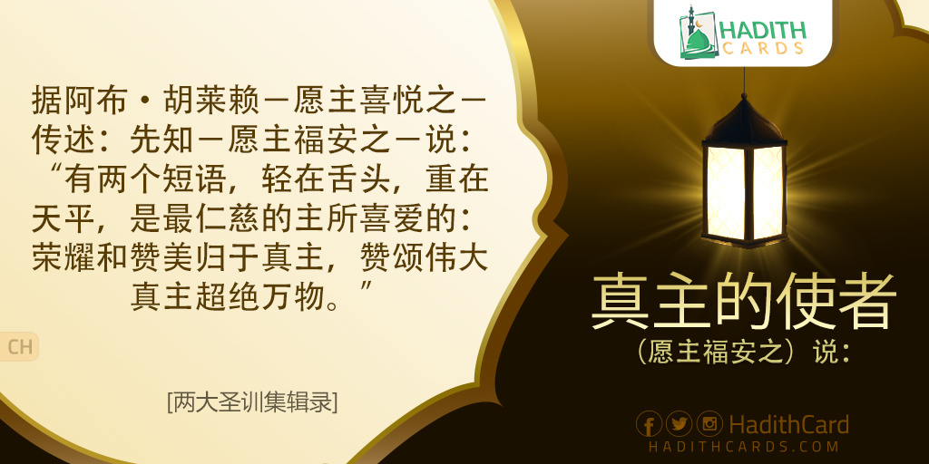 据阿布·胡莱赖-愿主喜悦之-传述:先知-愿主福安之-说:“有两个短语,轻在舌头,重在天平,是最仁慈的主所喜爱的:荣耀和赞美归于真主,赞颂伟大真主超绝万物