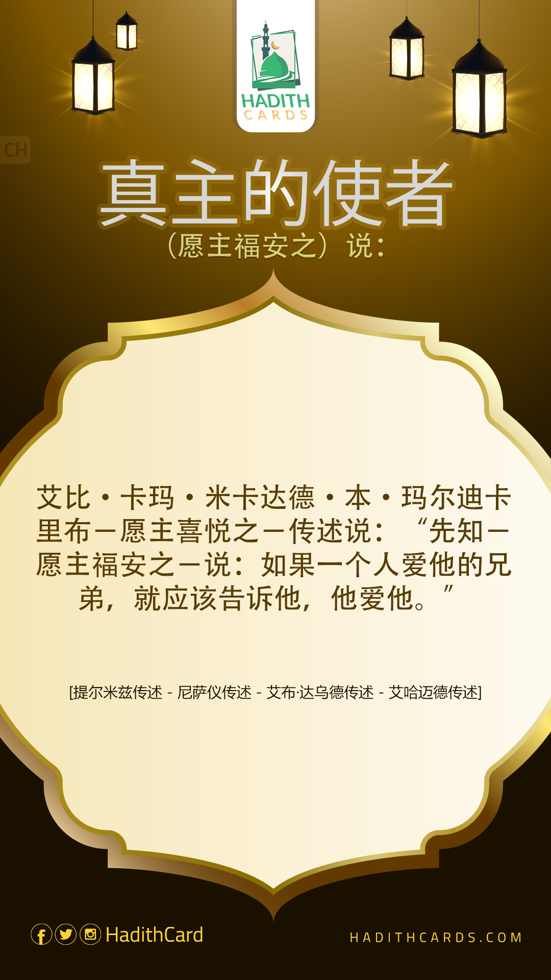 艾比•卡玛•米卡达德•本•玛尔迪卡里布-愿主喜悦之-传述说:“先知-愿主福安之-说:如果一个人爱他的兄弟,就应该告诉他,他爱他