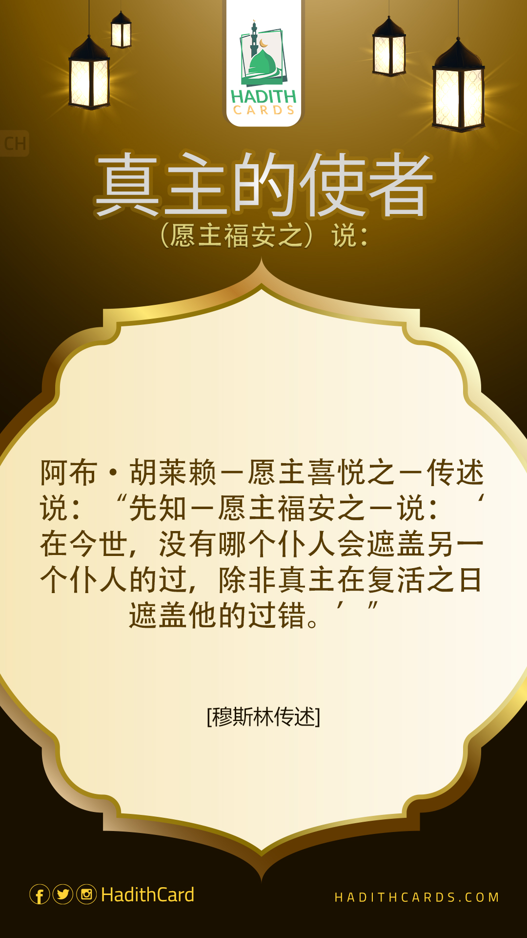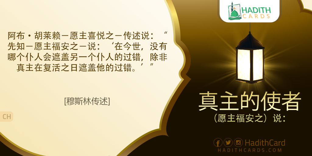 阿布·胡莱赖-愿主喜悦之-传述说:“先知-愿主福安之-说:‘在今世,没有哪个仆人会遮盖另一个仆人的过错,除非真主在复活之日遮盖他的过错