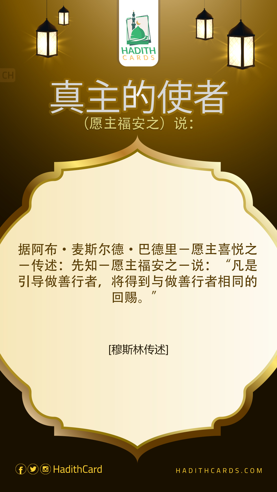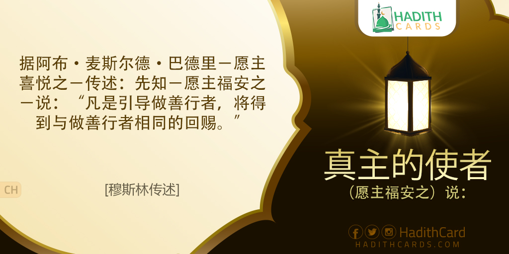 据阿布·麦斯尔德·巴德里-愿主喜悦之-传述:先知-愿主福安之-说:“凡是引导做善行者,将得到与做善行者相同的回赐