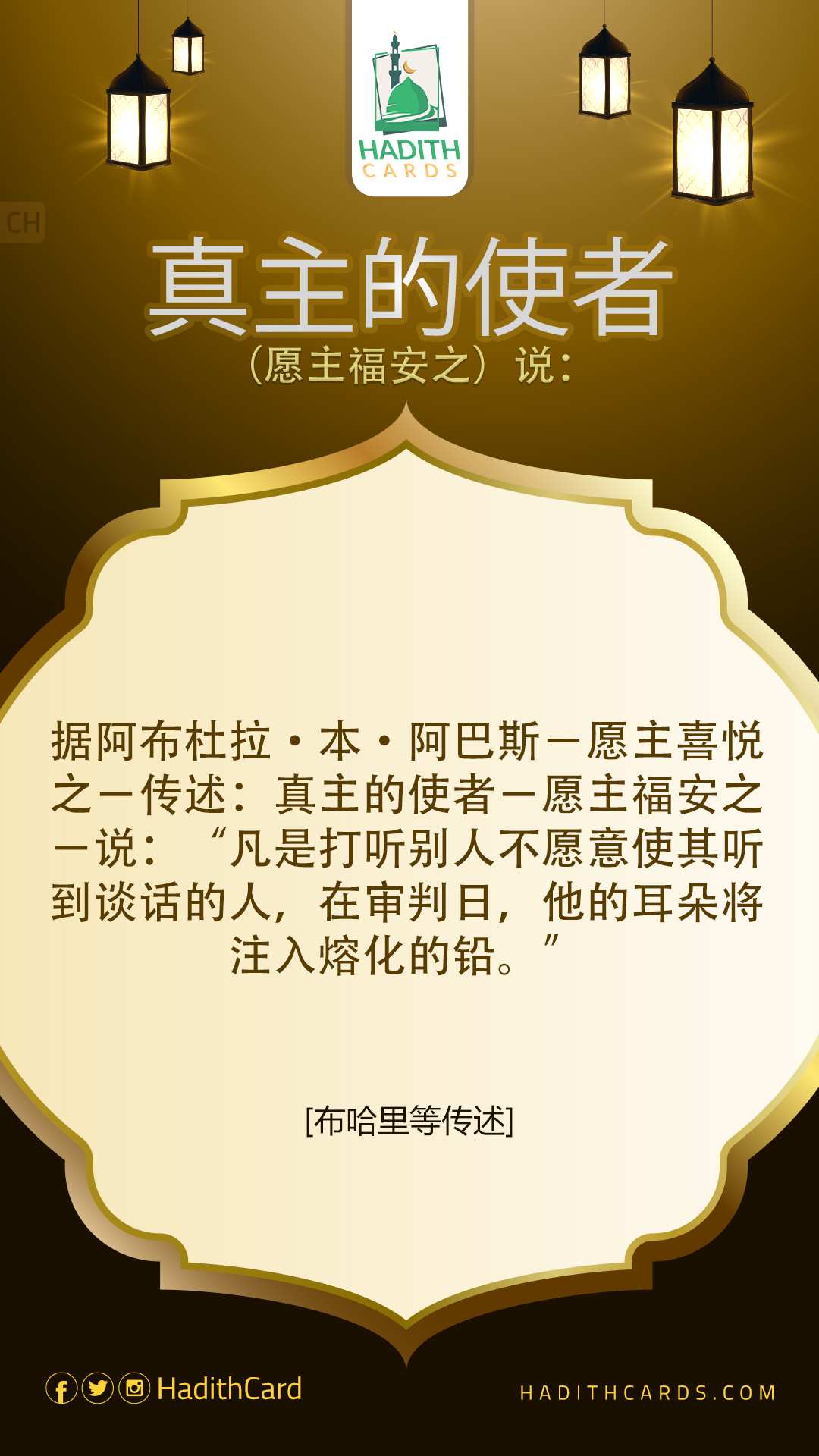 据阿布杜拉·本·阿巴斯-愿主喜悦之-传述:真主的使者-愿主福安之-说:“凡是打听别人不愿意使其听到谈话的人,在审判日,他的耳朵将注入熔化的铅