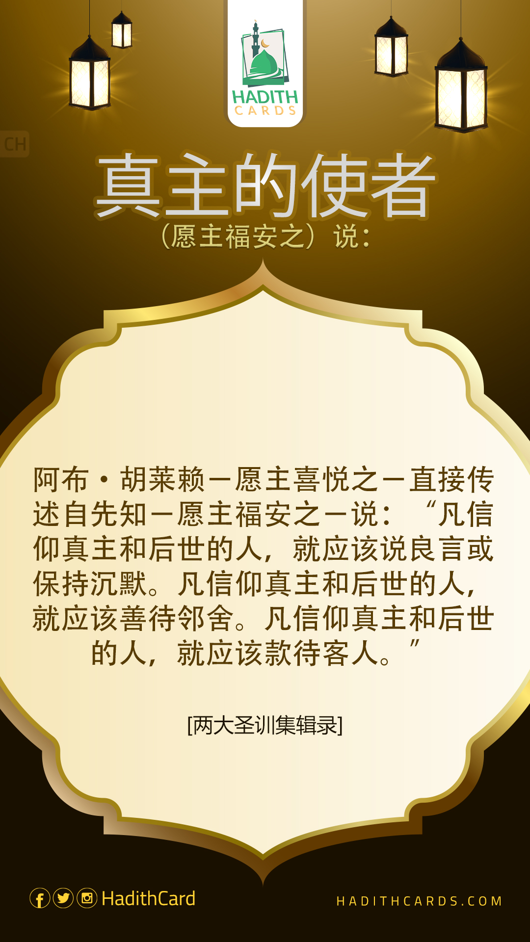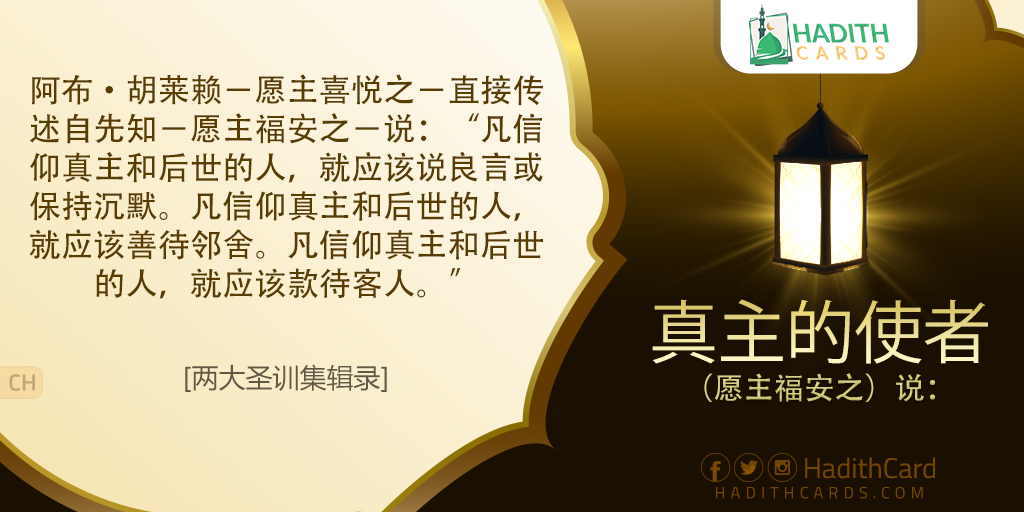 阿布·胡莱赖-愿主喜悦之-直接传述自先知-愿主福安之-说:“凡信仰真主和后世的人,就应该说良言或保持沉默。凡信仰真主和后世的人,就应该善待邻舍。凡信仰真主和后世的人,就应该款待客人