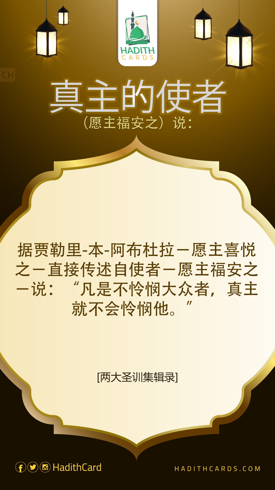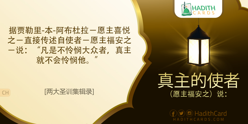 据贾勒里∙本∙阿布杜拉-愿主喜悦之-直接传述自使者-愿主福安之-说:“凡是不怜悯大众者,真主就不会怜悯他
