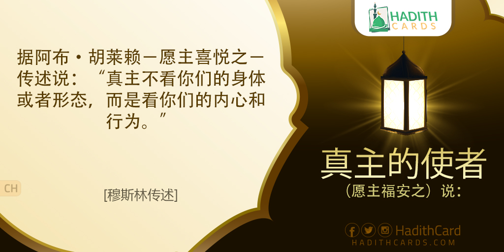 据阿布·胡莱赖-愿主喜悦之-传述说:“真主不看你们的身体或者形态,而是看你们的内心和行为。
