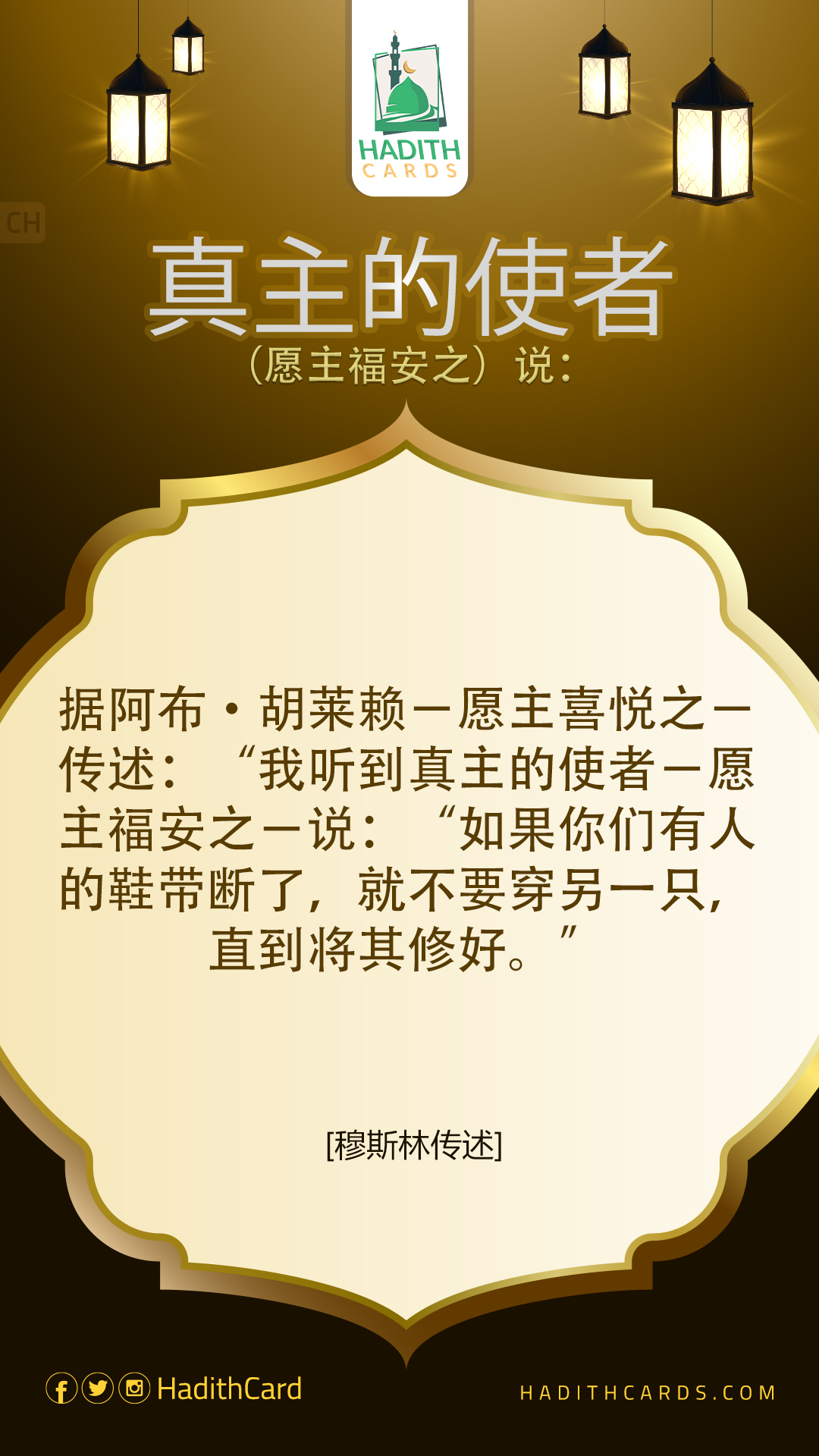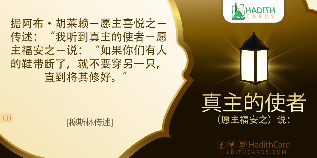 据阿布·胡莱赖-愿主喜悦之-传述:“我听到真主的使者-愿主福安之-说:“如果你们有人的鞋带断了,就不要穿另一只鞋,直到将其修好