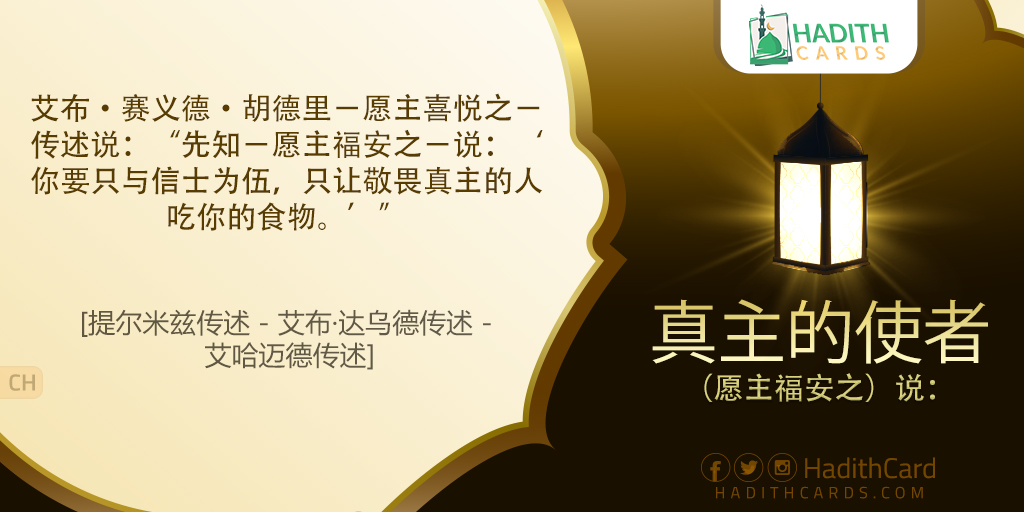 艾布·赛义德·胡德里-愿主喜悦之-传述说:“先知-愿主福安之-说:‘你要只与信士为伍,只让敬畏真主的人吃你的食物