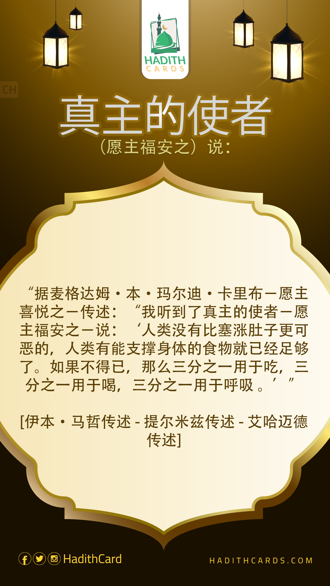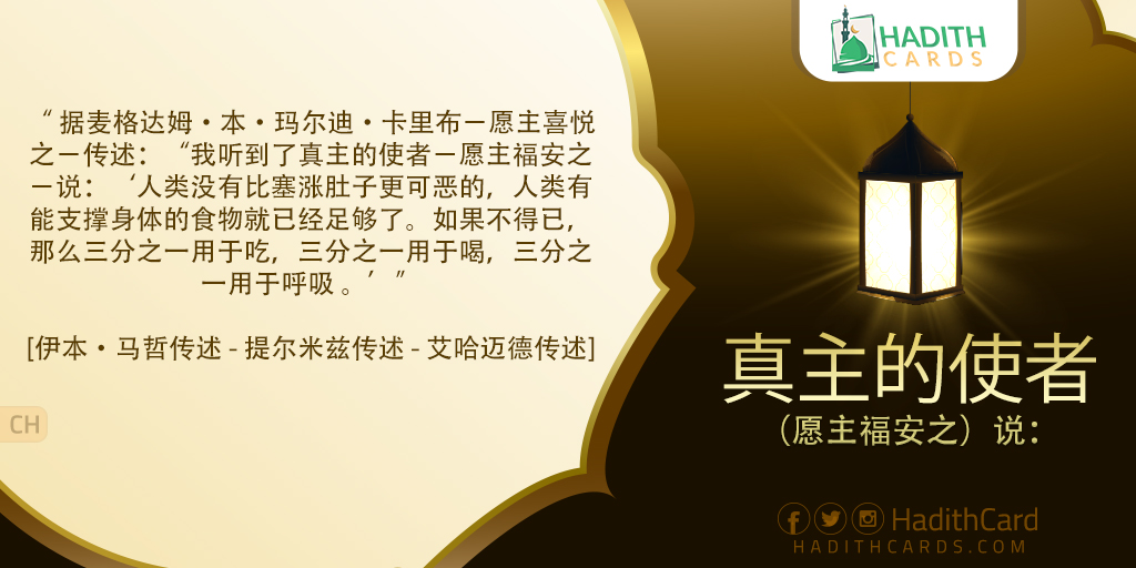 据麦格达姆·本·玛尔迪·卡里布-愿主喜悦之-传述:“我听到了真主的使者-愿主福安之-说:‘人类没有比塞涨肚子更可恶的,人类有能支撑身体的食物就已经足够了。如果不得已,那么三分之一用于吃,三分之一用于喝,三分之一用于呼吸 。
