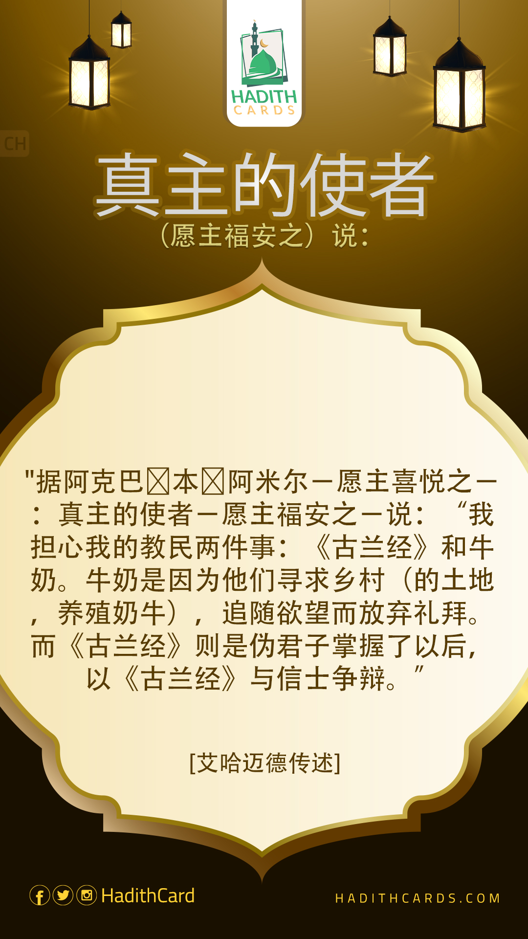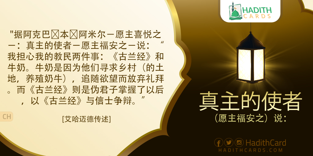 据阿克巴∙本∙阿米尔-愿主喜悦之-:真主的使者-愿主福安之-说:“我担心我的教民两件事:《古兰经》和牛奶。牛奶是因为他们寻求乡村(的土地,养殖奶牛),追随欲望而放弃礼拜。而《古兰经》则是伪君子掌握了以后,以《古兰经》与信士争辩