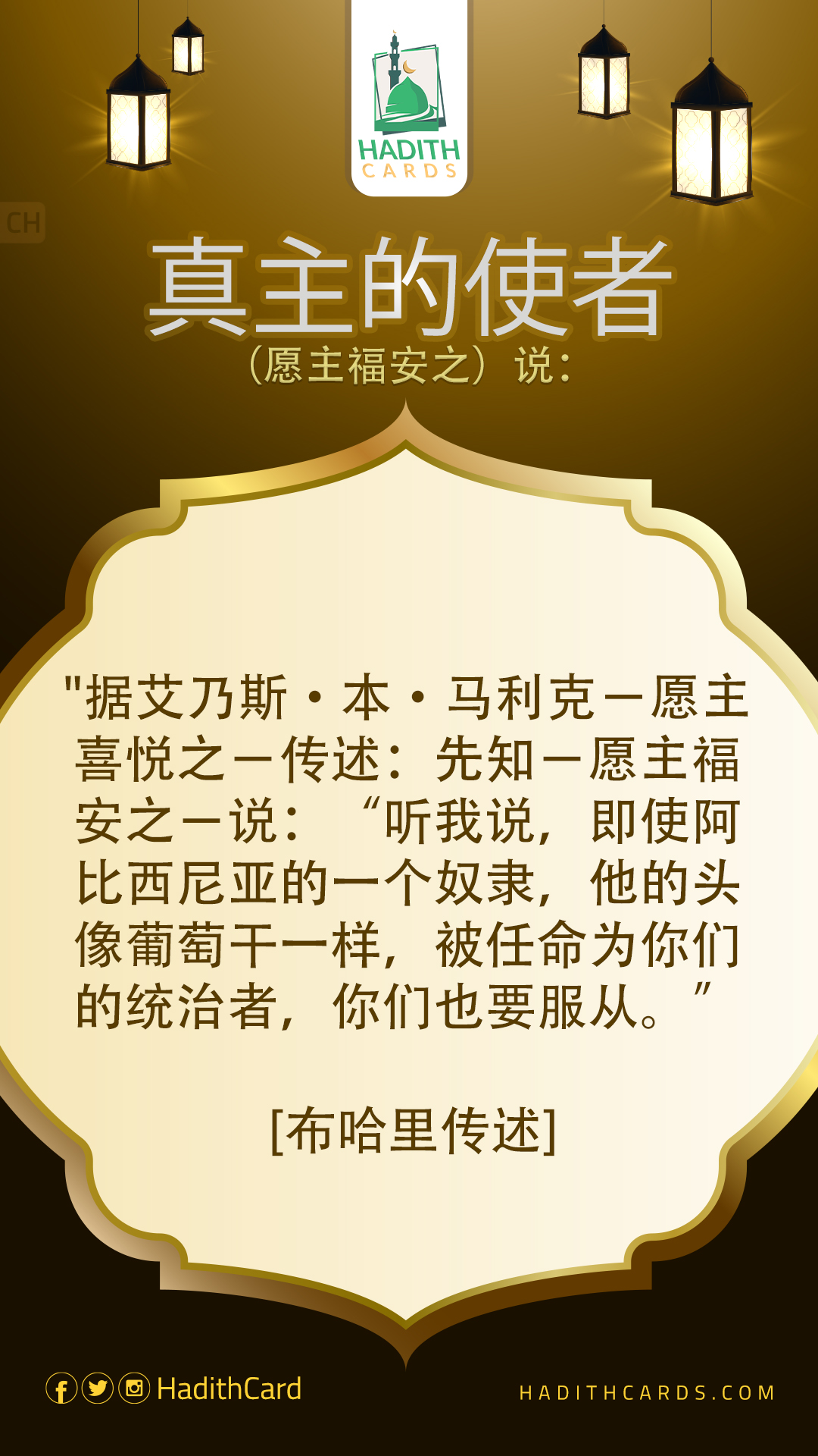 据艾乃斯·本·马利克-愿主喜悦之-传述:先知-愿主福安之-说:“听我说,即使阿比西尼亚的一个奴隶,他的头像葡萄干一样,被任命为你们的统治者,你们也要服从