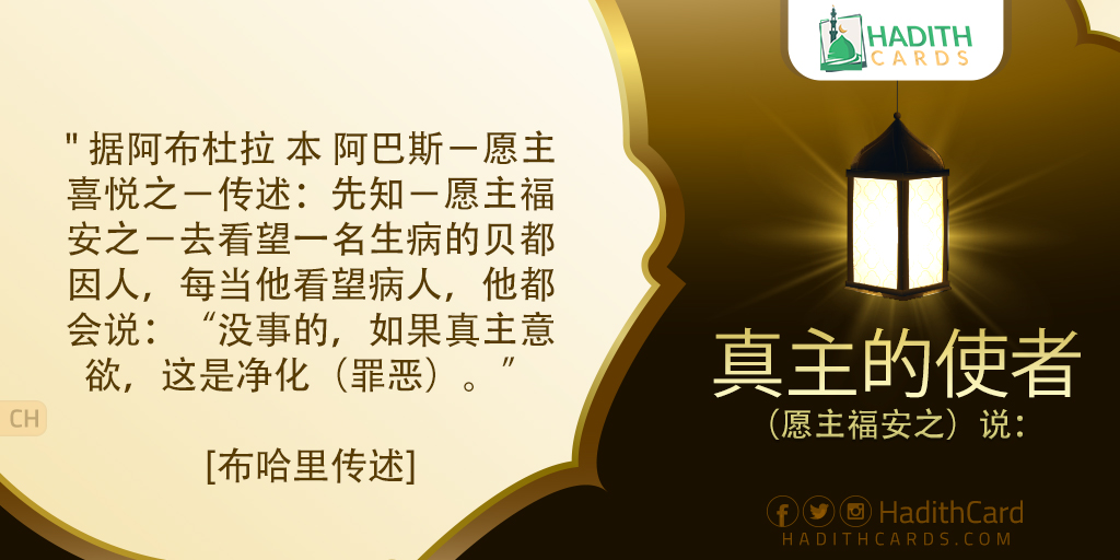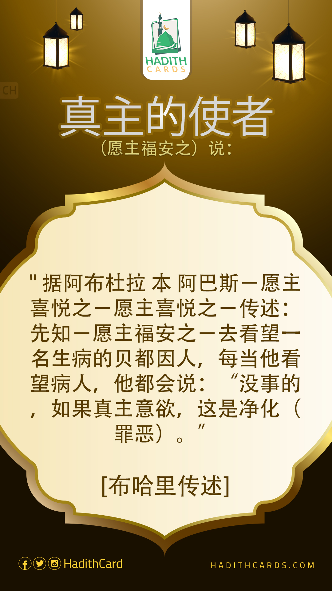 据阿布杜拉∙本∙阿巴斯-愿主喜悦之-传述:先知-愿主福安之-去看望一名生病的贝都因人,每当他看望病人,他都会说:“没事的,如果真主意欲,这是净化(罪恶)