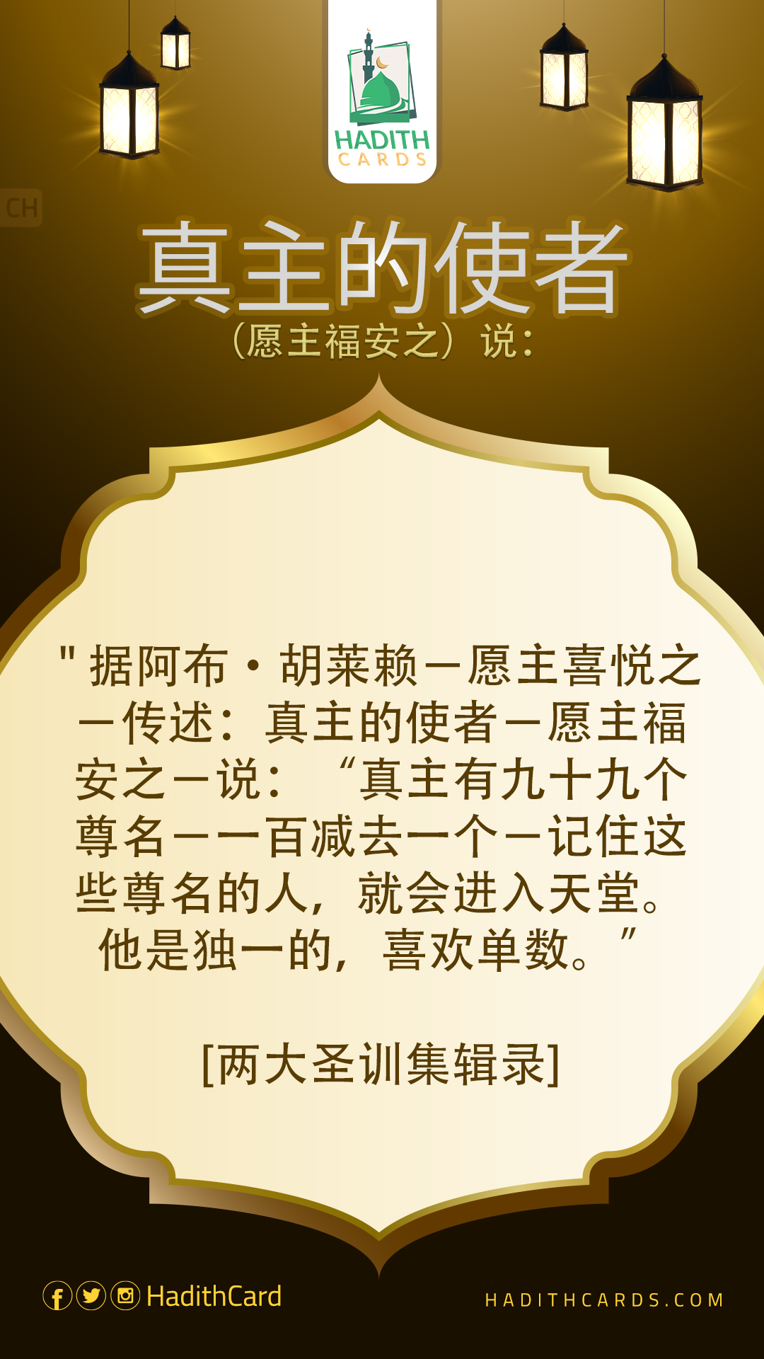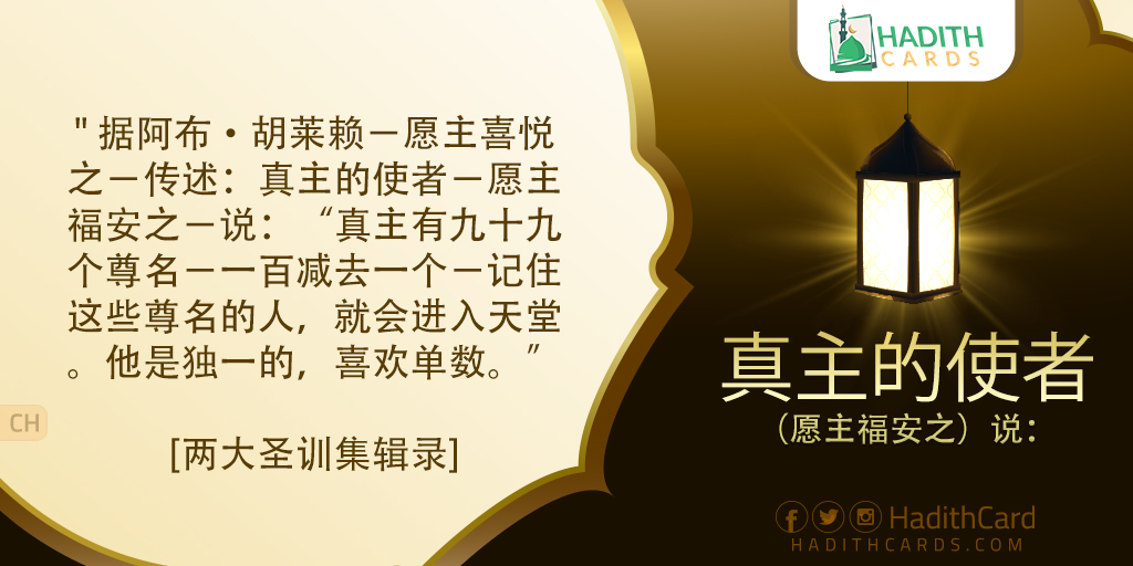 据阿布·胡莱赖-愿主喜悦之-传述:真主的使者-愿主福安之-说:“真主有九十九个尊名-一百减去一个-记住这些尊名的人,就会进入天堂。他是独一的,喜欢单数