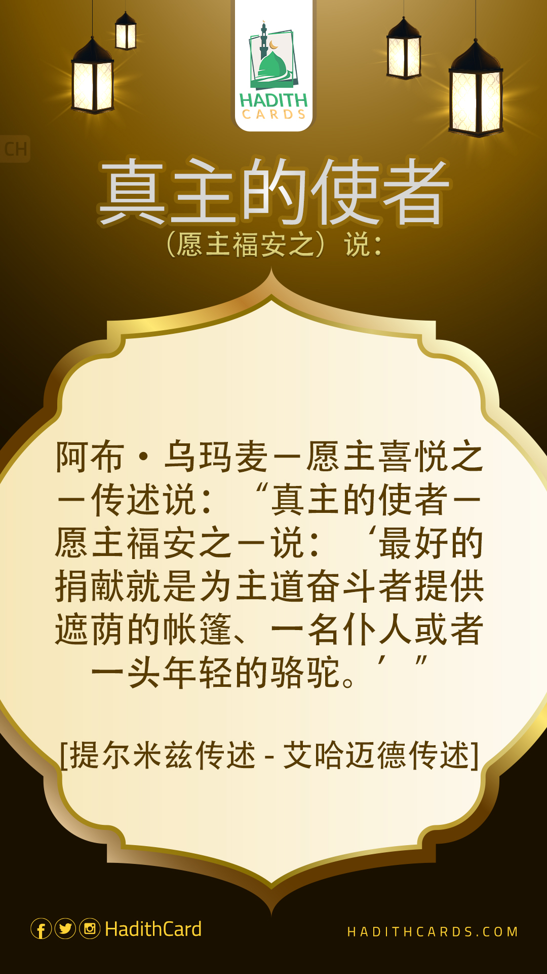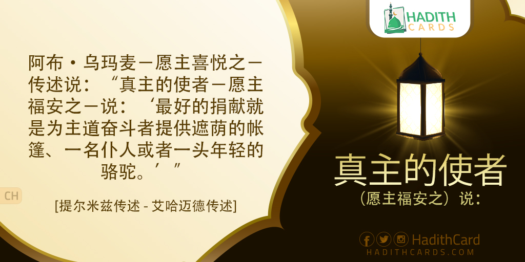 阿布·乌玛麦-愿主喜悦之-传述说:“真主的使者-愿主福安之-说:‘最好的捐献就是为主道奋斗者提供遮荫的帐篷、一名仆人或者一头年轻的骆驼