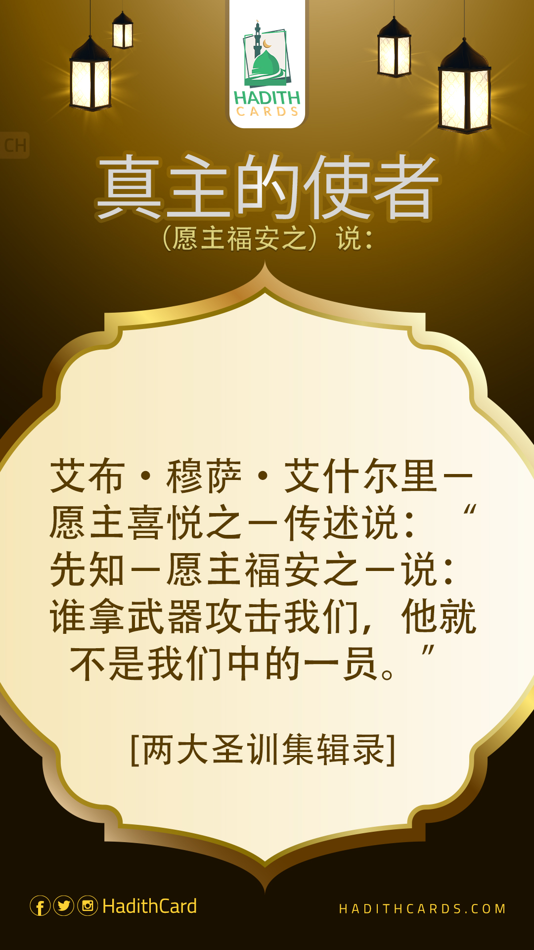 艾布•穆萨·艾什尔里-愿主喜悦之-传述说:“先知-愿主福安之-说:谁拿武器攻击我们,他就不是我们中的一员。