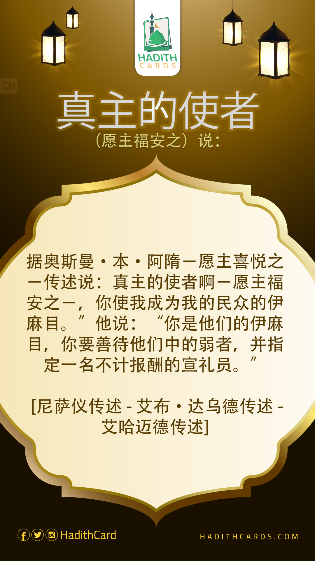 据奥斯曼·本·阿隋-愿主喜悦之-传述说:真主的使者啊-愿主福安之-,你使我成为我的民众的伊麻目。”他说:“你是他们的伊麻目,你要善待他们中的弱者,并指定一名不计报酬的宣礼员