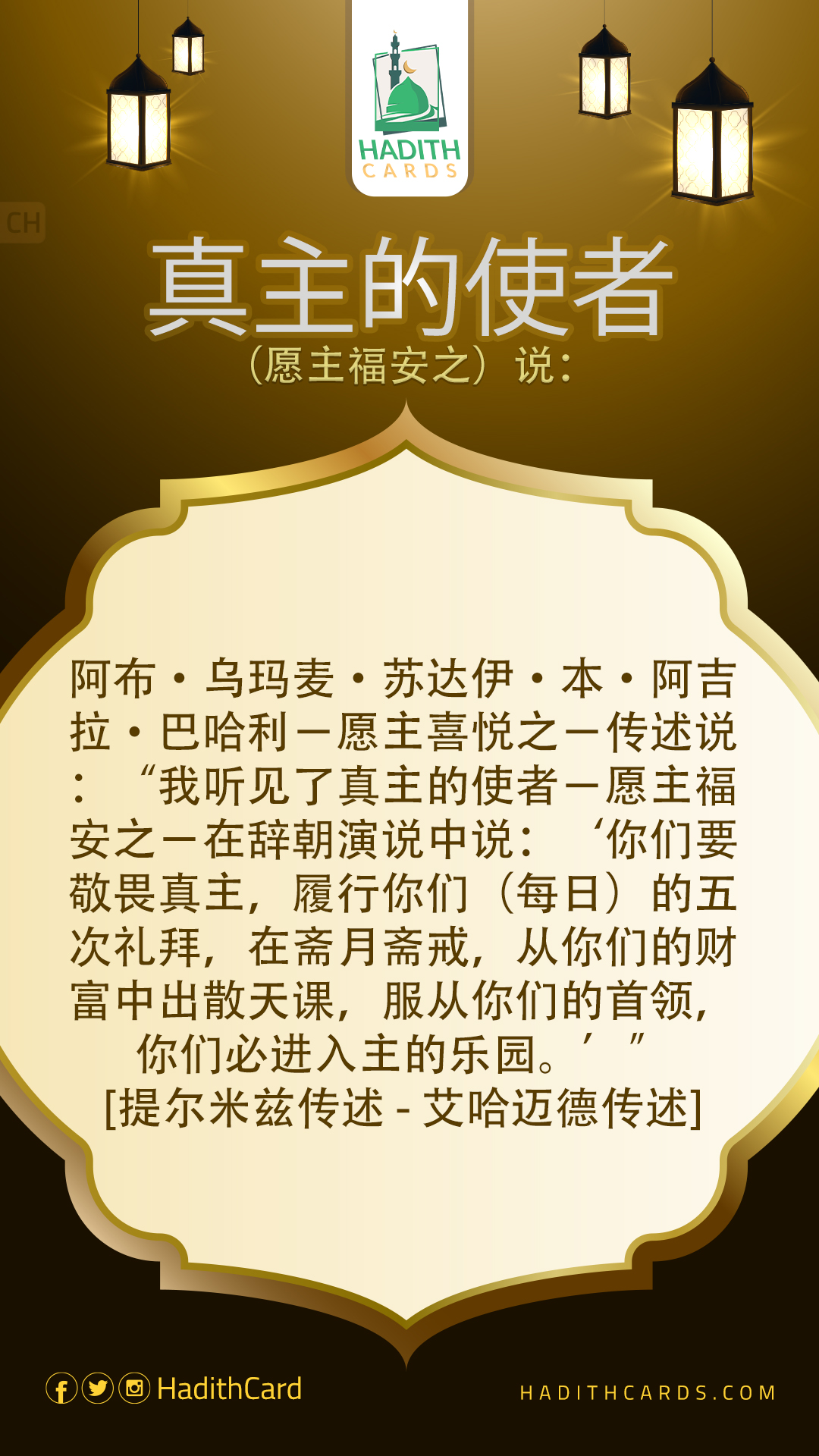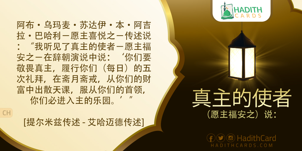 阿布·乌玛麦·苏达伊·本·阿吉拉·巴哈利-愿主喜悦之-传述说:“我听见了真主的使者-愿主福安之-在辞朝演说中说:‘你们要敬畏真主,履行你们(每日)的五次礼拜,在斋月斋戒,从你们的财富中出散天课,服从你们的首领,你们必进入主的乐园
