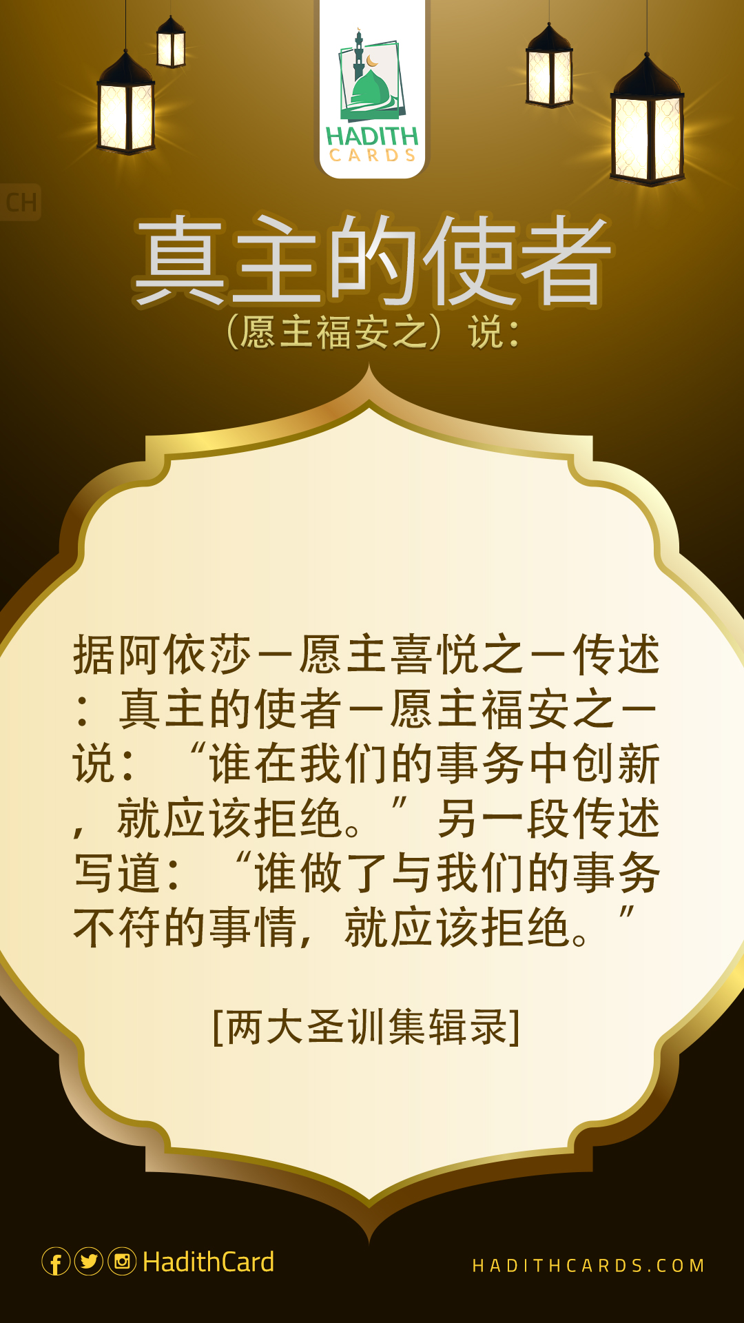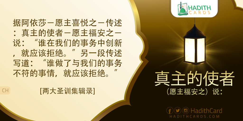 据阿依莎-愿主喜悦之-传述:真主的使者-愿主福安之-说:“谁在我们的事务中创新,就应该拒绝。”另一段传述写道:“谁做了与我们的事务不符的事情,就应该拒绝